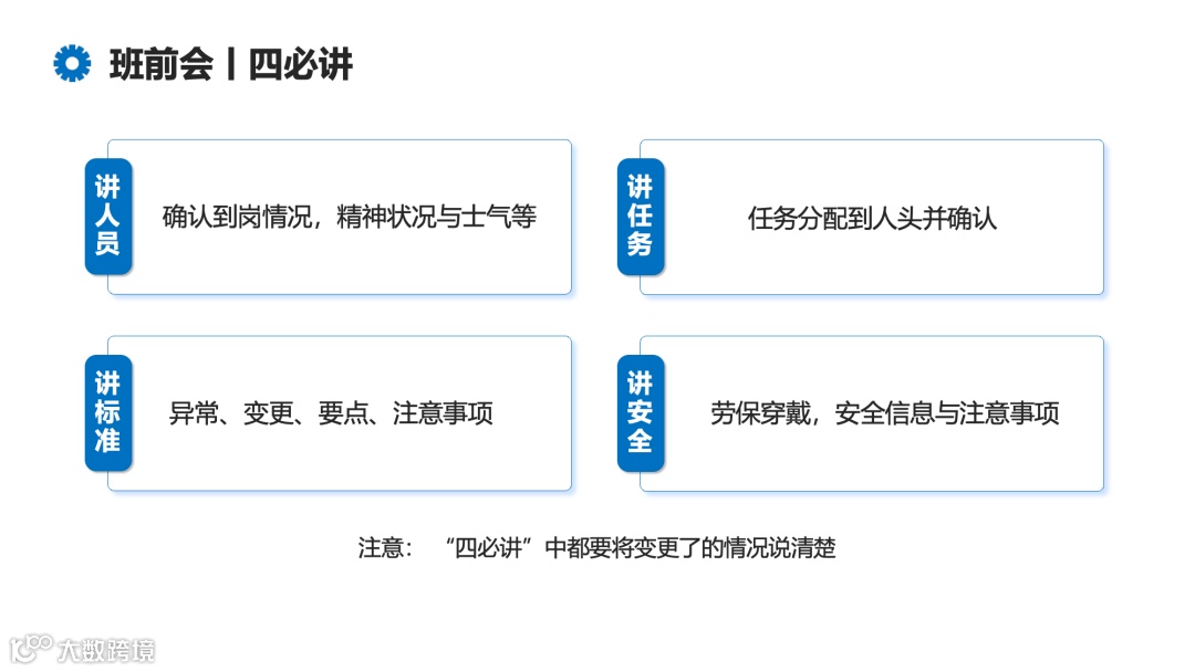 班前会的“四必讲”,要落到具体动作上:讲人员,是“小王今天负责调试设备,小李协助,注意小王刚调岗,有问题及时沟通”;讲安全,是“今天要使用登高梯,必须确认梯脚防滑垫完好,有人扶着才能上去”。