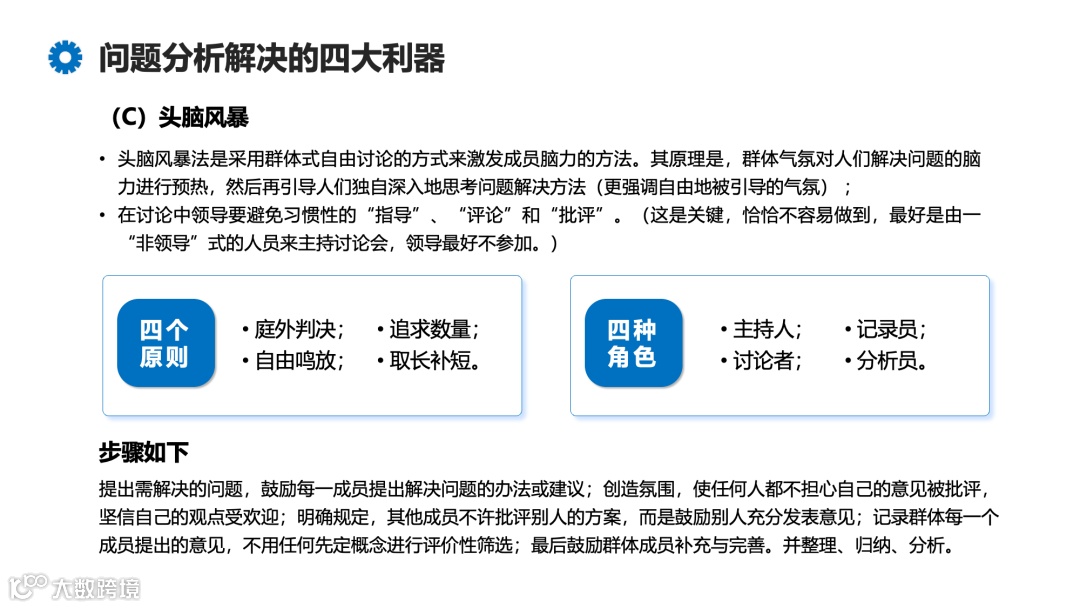 某食品班组发现产品保质期缩短,用5个为什么追问:为什么保质期短?因为杀菌不彻底;为什么杀菌不彻底?因为杀菌釜温度没达到设定值;为什么温度不够?因为温控器校准不准;为什么校准不准?因为校准周期是3个月,太长;为什么周期长?因为校准要请外部机构,麻烦——最终将校准周期调整为1个月,从根本上解决问题。头脑风暴是凝聚团队智慧的有效方式,但关键在于“自由表达”的氛围。
