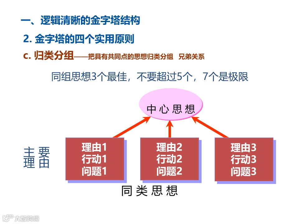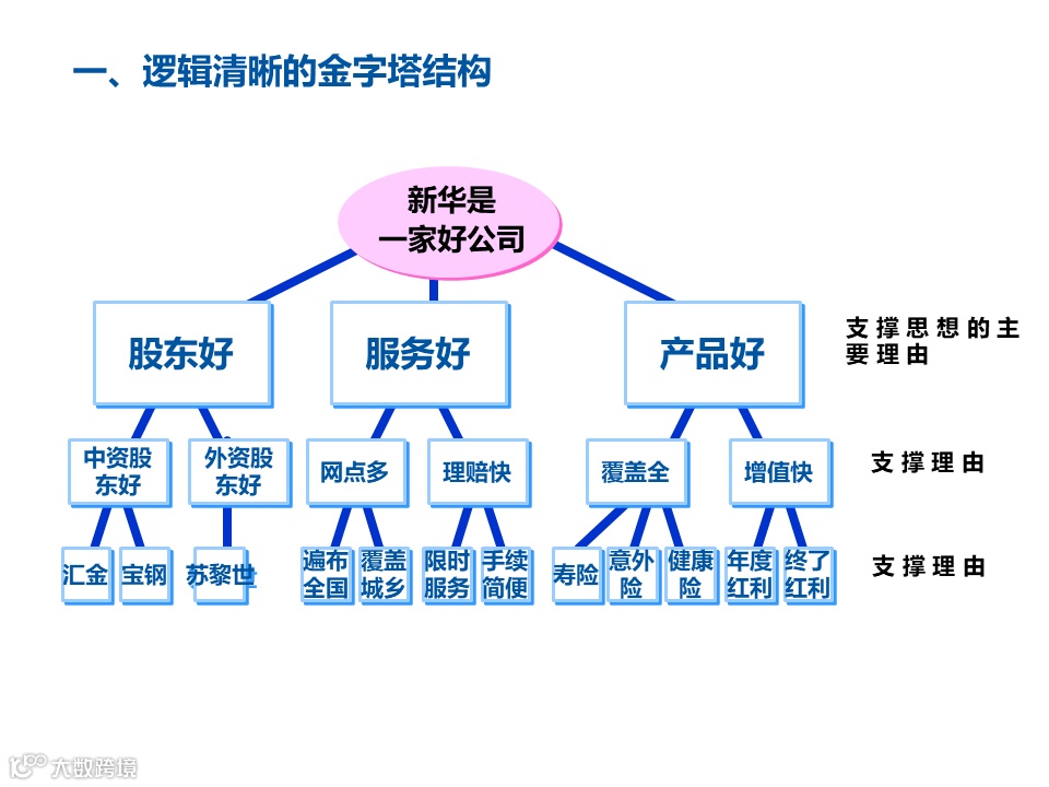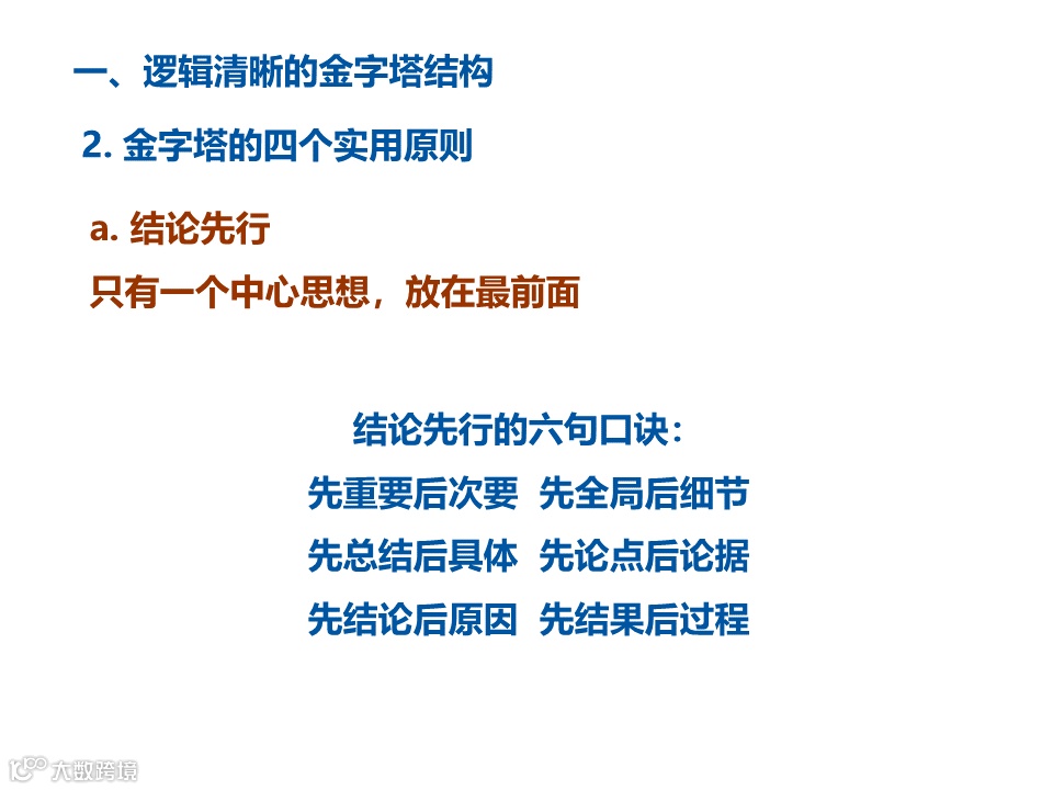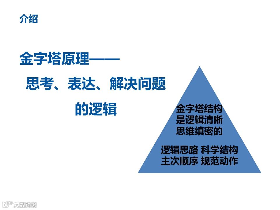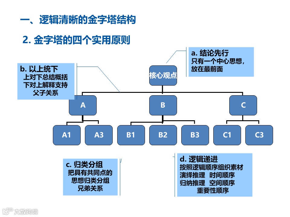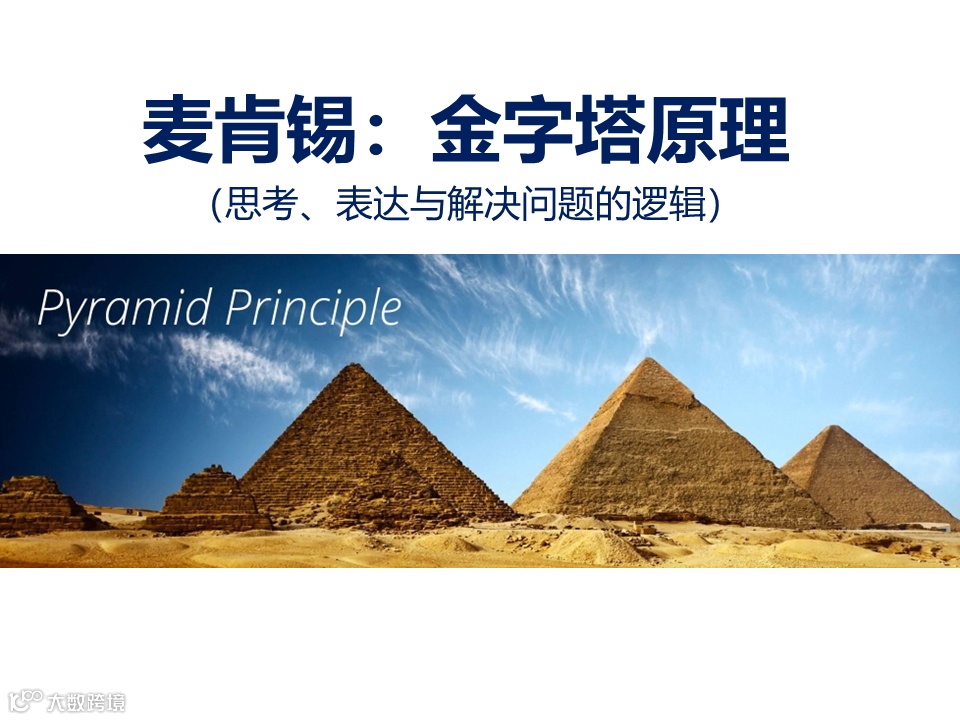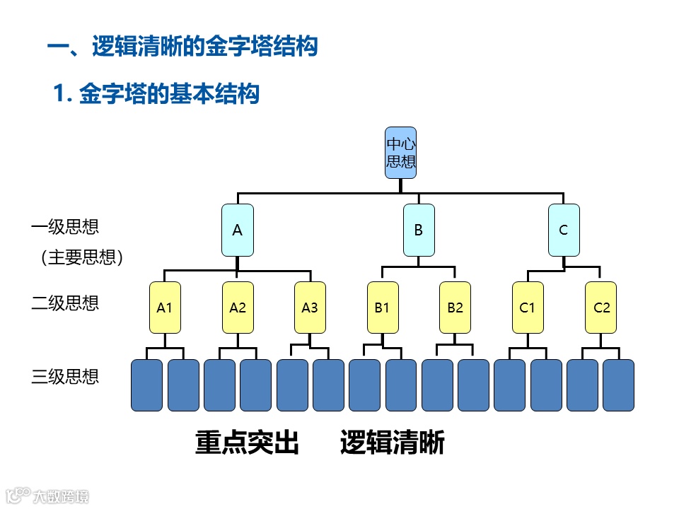“金字塔原理简单来说就是:我们在写作、思考、表达、解决问题的时候,要像金字塔结构一样,既突出重点,又有层次性和逻辑性。 金字塔通常可以分为“塔尖、塔身、塔基”三个部分。塔尖就是你要表达的总的论点、结论、你要干什么,塔身就是你的分论点,塔基就是支撑你论点的论据。