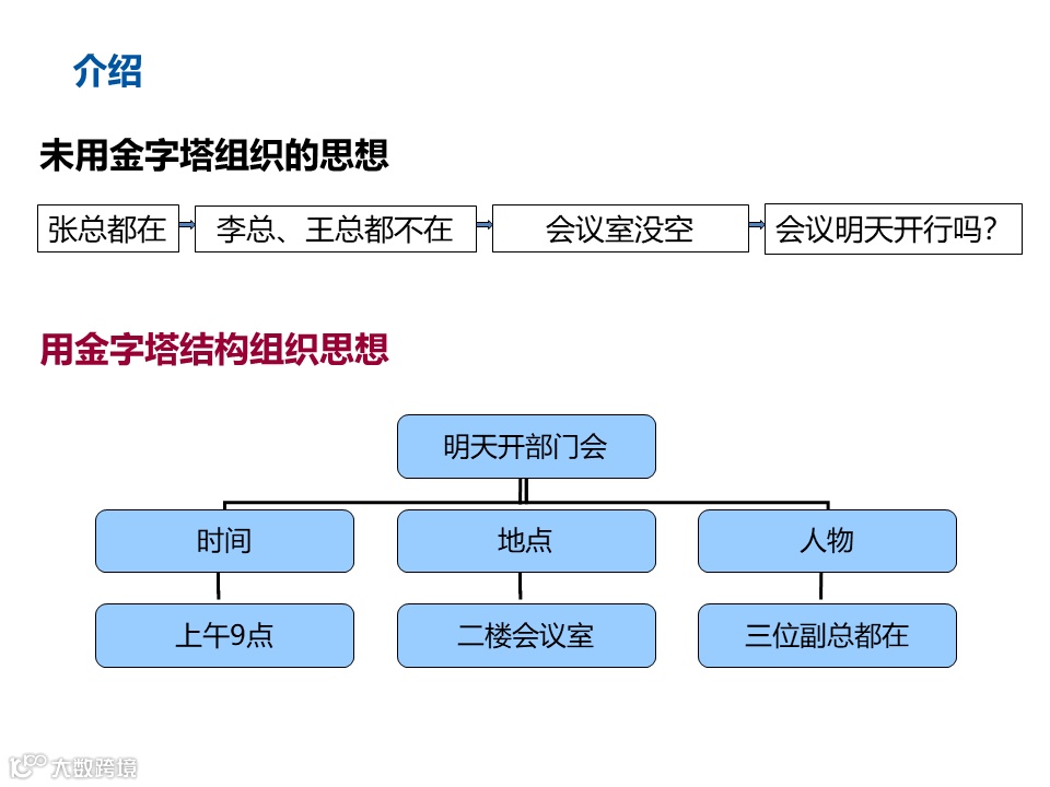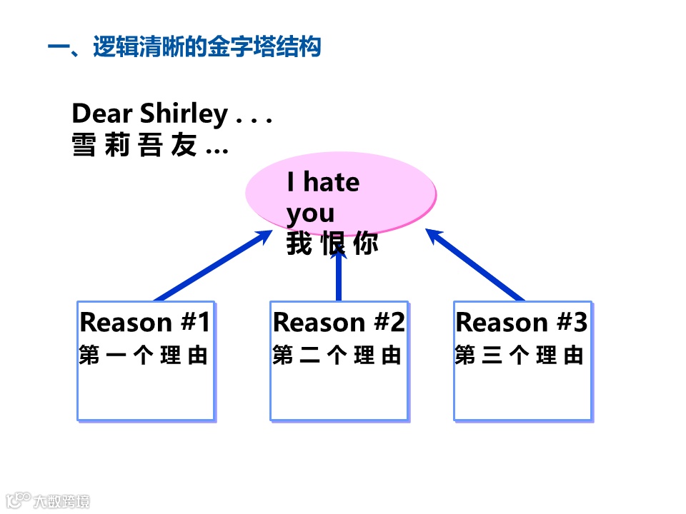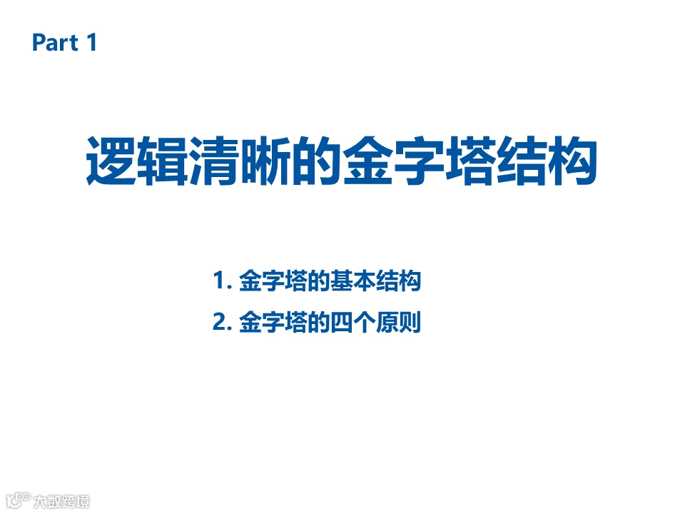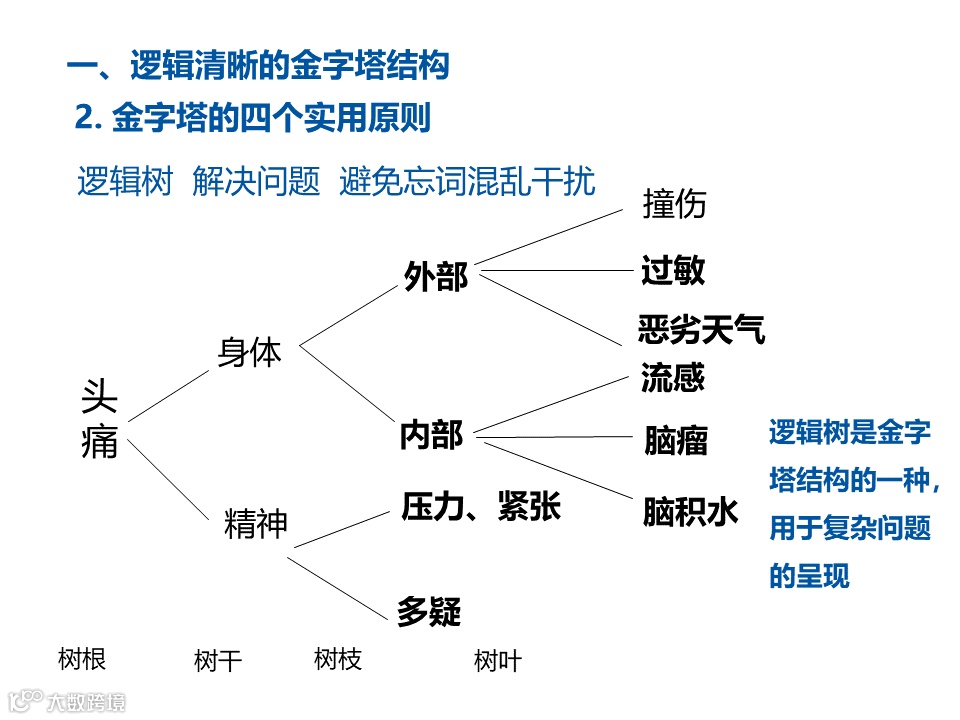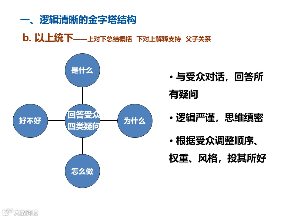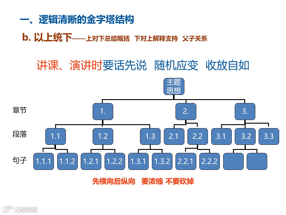 “金字塔原理简单来说就是:我们在写作、思考、表达、解决问题的时候,要像金字塔结构一样,既突出重点,又有层次性和逻辑性。 金字塔通常可以分为“塔尖、塔身、塔基”三个部分。塔尖就是你要表达的总的论点、结论、你要干什么,塔身就是你的分论点,塔基就是支撑你论点的论据。