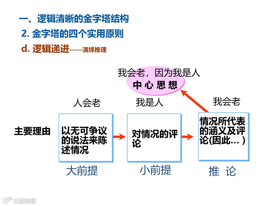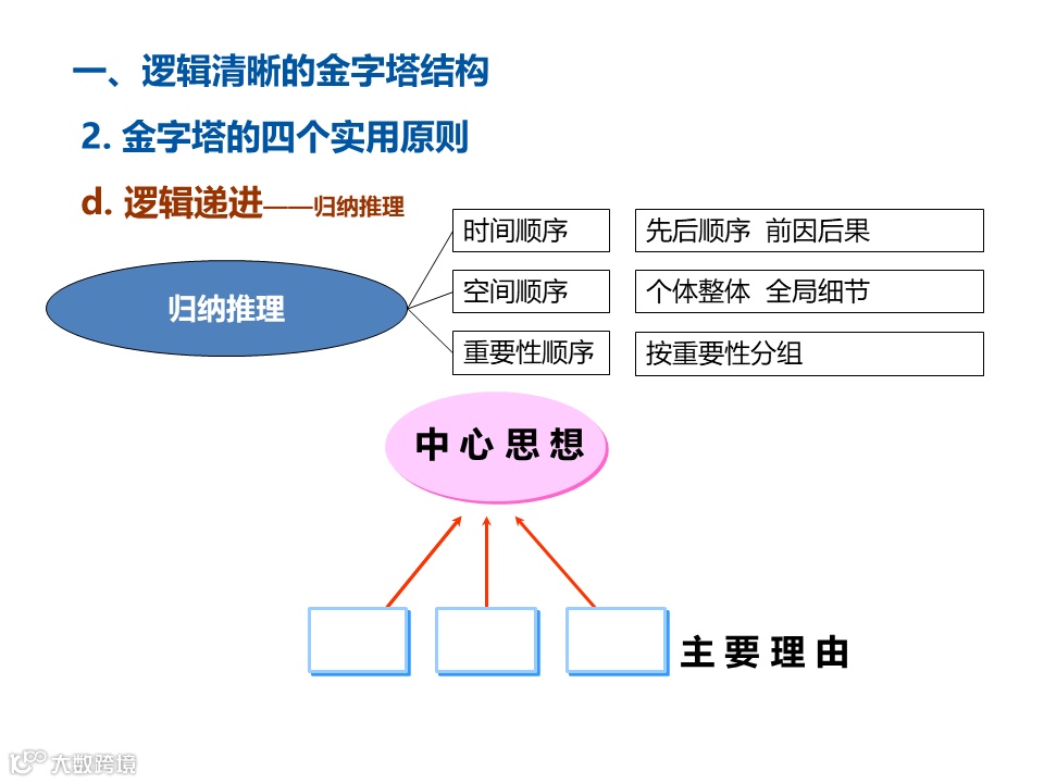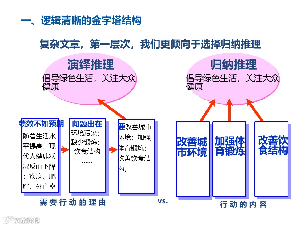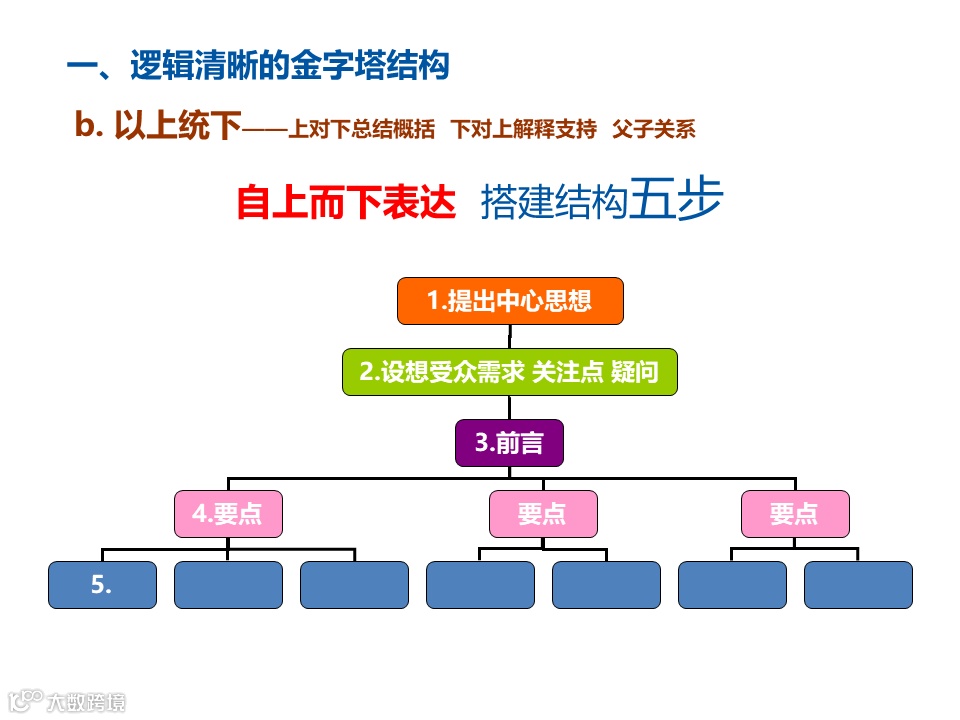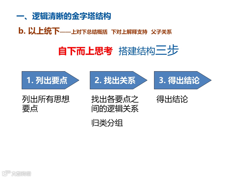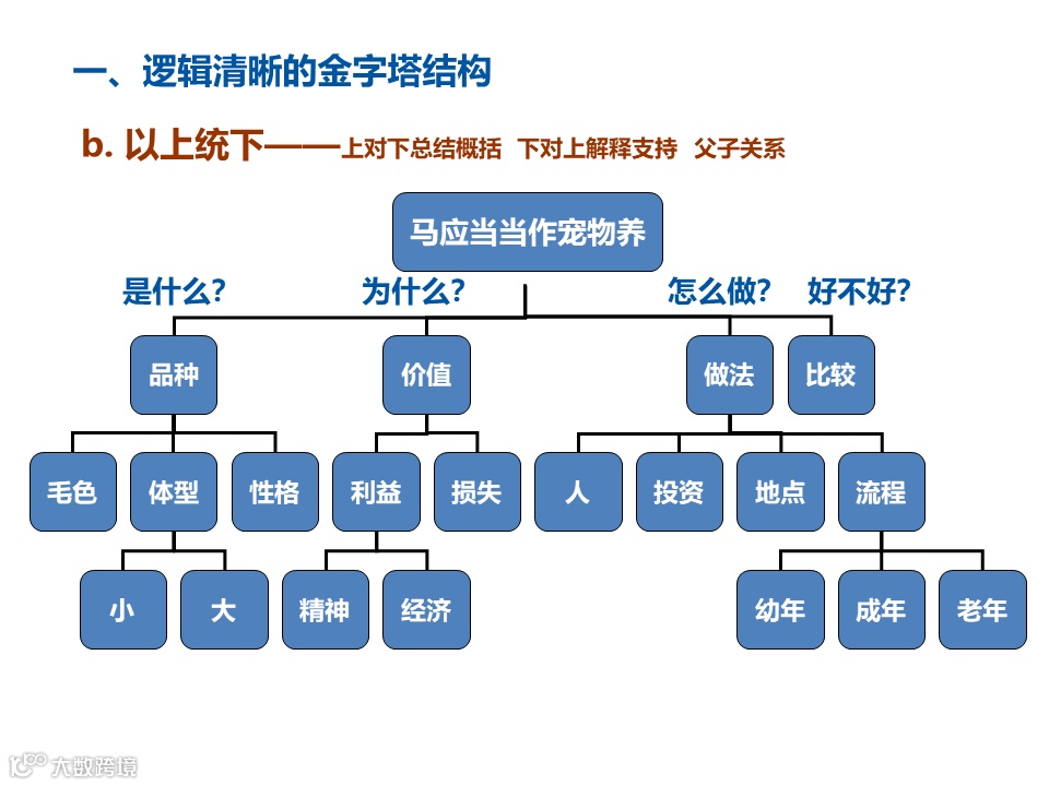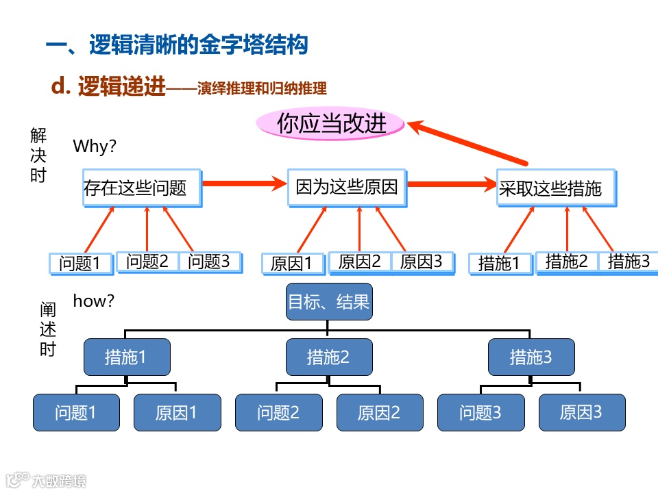“金字塔原理简单来说就是:我们在写作、思考、表达、解决问题的时候,要像金字塔结构一样,既突出重点,又有层次性和逻辑性。 金字塔通常可以分为“塔尖、塔身、塔基”三个部分。塔尖就是你要表达的总的论点、结论、你要干什么,塔身就是你的分论点,塔基就是支撑你论点的论据。