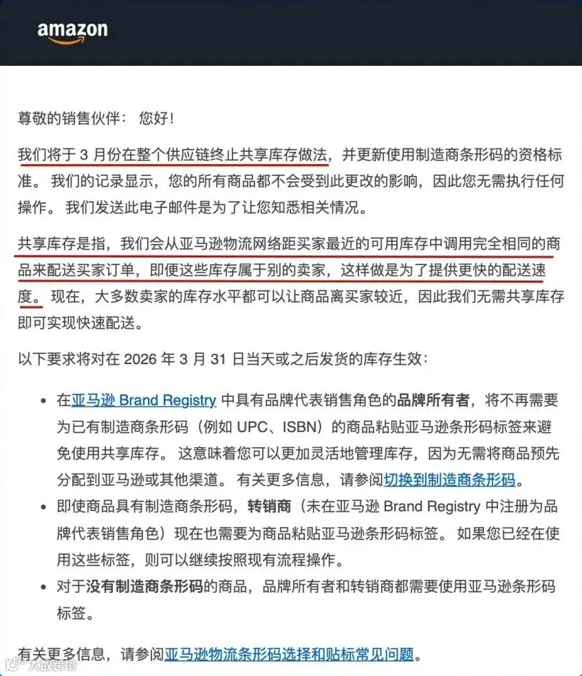 2026年3月31日,亚马逊FBA库存管理新规正式实施:全面取消共享库存机制,并强制非品牌卖家统一使用X00条形码。新规覆盖美国、加拿大、墨西哥、欧洲、澳大利亚及日本六大核心站点,直接影响卖家发货流程、入仓效率及索赔权益。