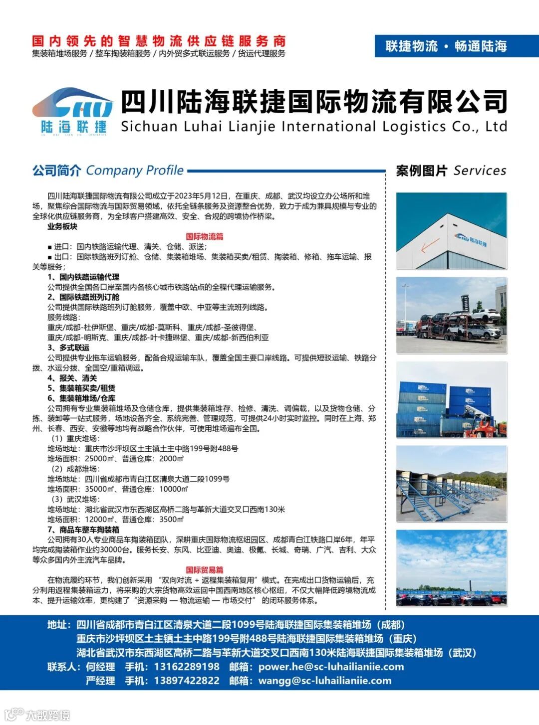 四川陆海联捷国际物流有限公司成立于2023年5月,立足重庆、成都、武汉,专注国际物流与贸易领域,依托全链条服务及资源整合优势,致力于提供高效、安全、合规的全球化供应链解决方案。