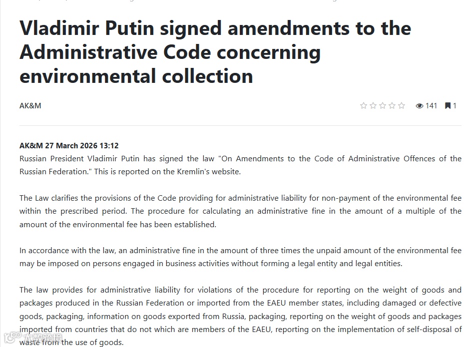 2026年2月普京签署的《行政违法法典》修正案明确:未按时缴纳环保费的法人实体将面临未缴金额三倍的行政罚款。