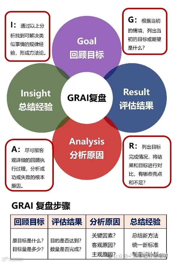 GRAI,是Goal(目标)、Result(结果)、Analysis(分析)和Insight(洞察力/总结)这四个关键步骤的首字母缩写。它就像一个精密的“炼金炉”,帮助我们全面而深入地审视过去,从实践中发现问题,总结经验,最终提炼出有价值的规律,为我们未来的行动提供清晰的指引。