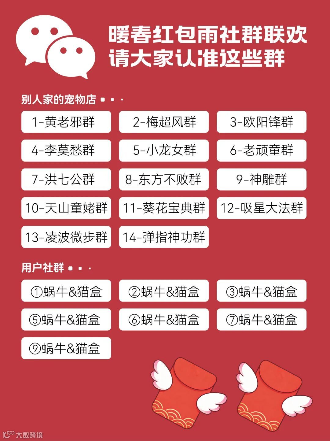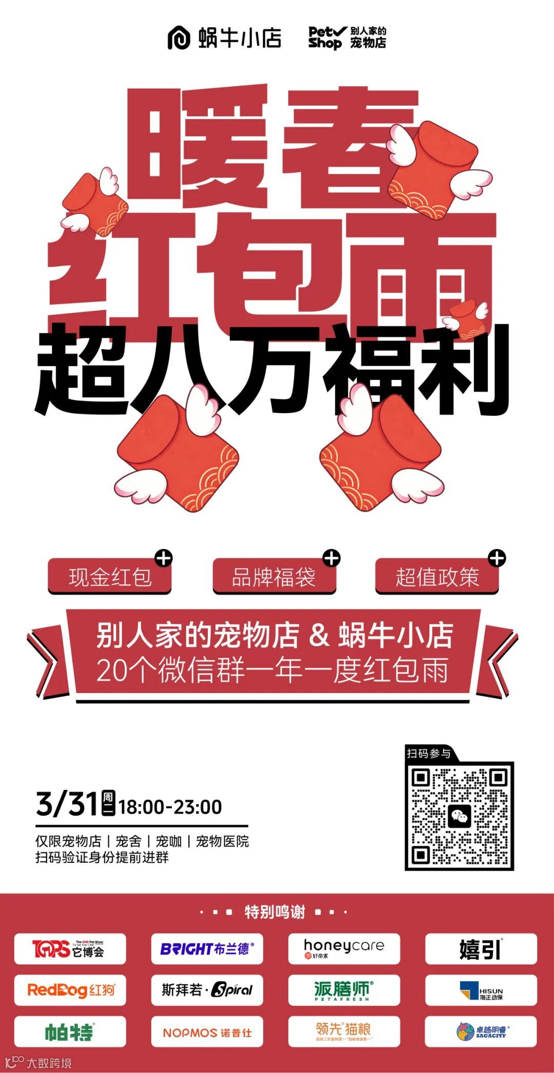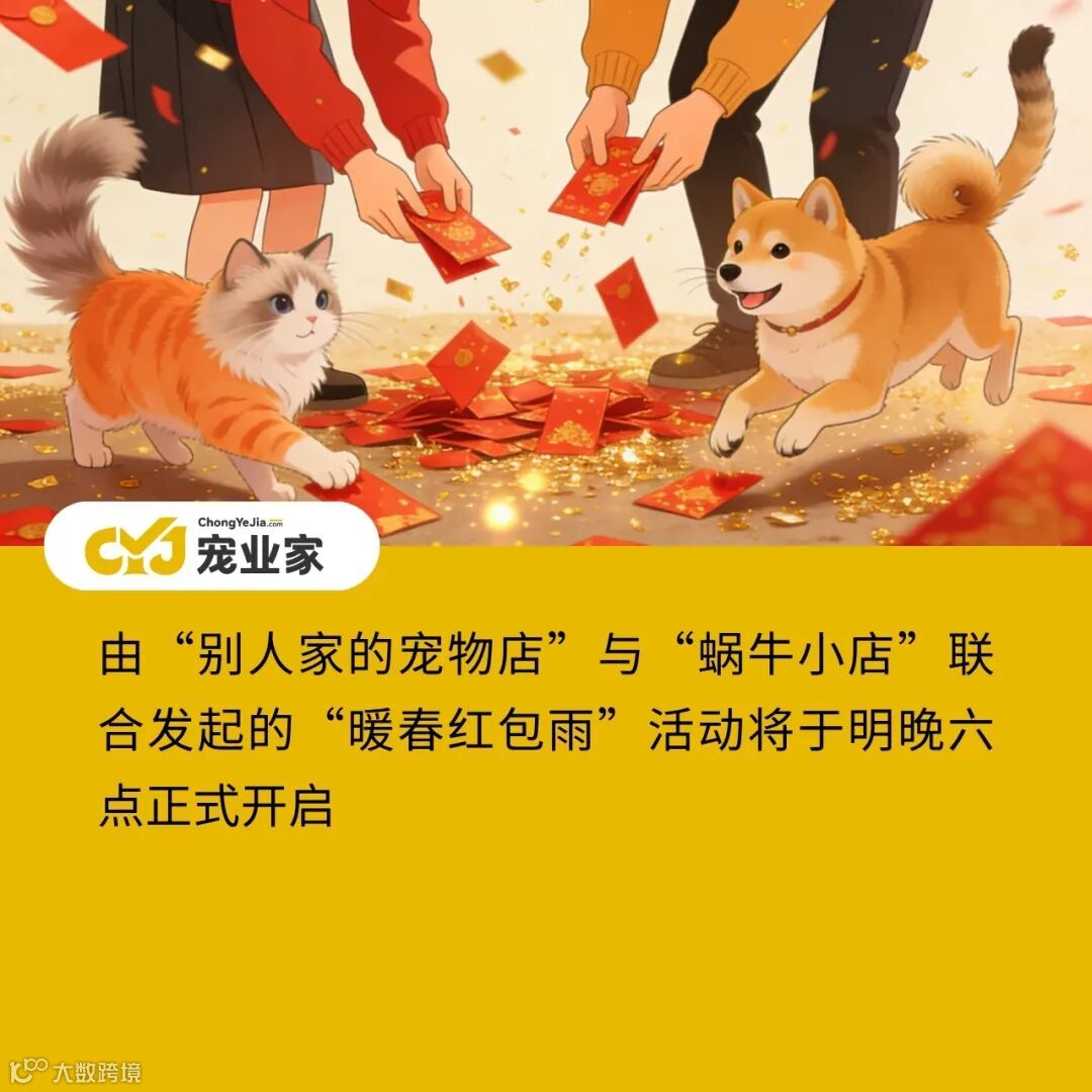 暖春时节,由“别人家的宠物店”与“蜗牛小店”联合发起的“暖春红包雨”活动将于3月31日18:00正式启动。十余家品牌将在线派发总价值超80000元的现金红包及产品福袋。
