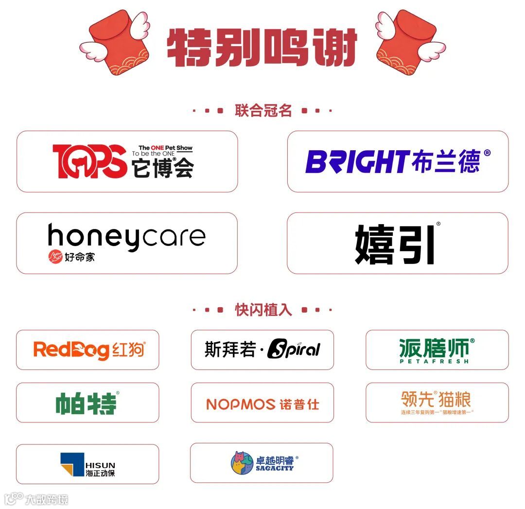 冠名赞助方:TOPS它博会、嬉引、布兰德、honeycare好命家;快闪品牌:帕特、领先、红狗、斯拜若、派膳师、海正动保、诺普仕、卓越明睿。