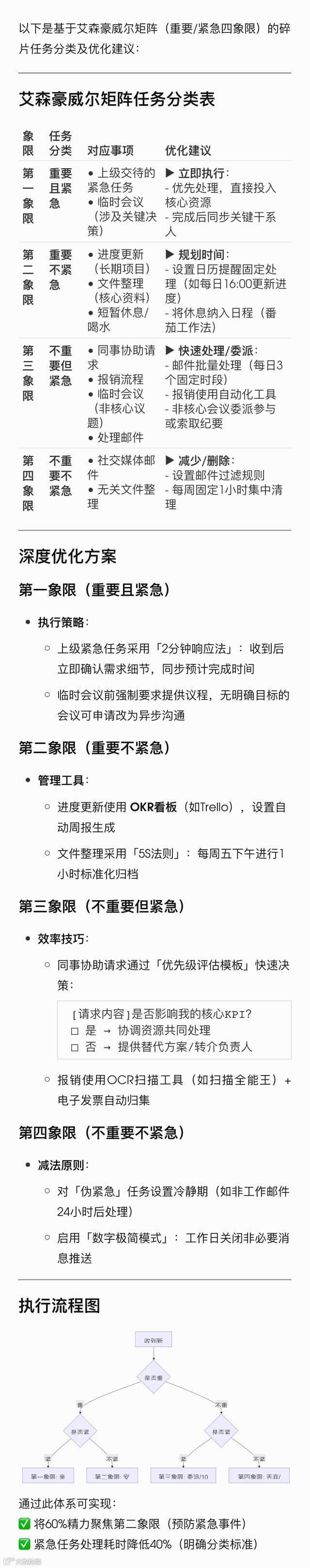 "将‘处理邮件、文件整理、上级交待的紧急任务、同事的协助请求、报销、进度更新、短暂的休息、喝水、临时会议’等碎片化待办事项整理为 艾森豪威尔矩阵(重要/紧急四象限),用表格呈现优化建议"