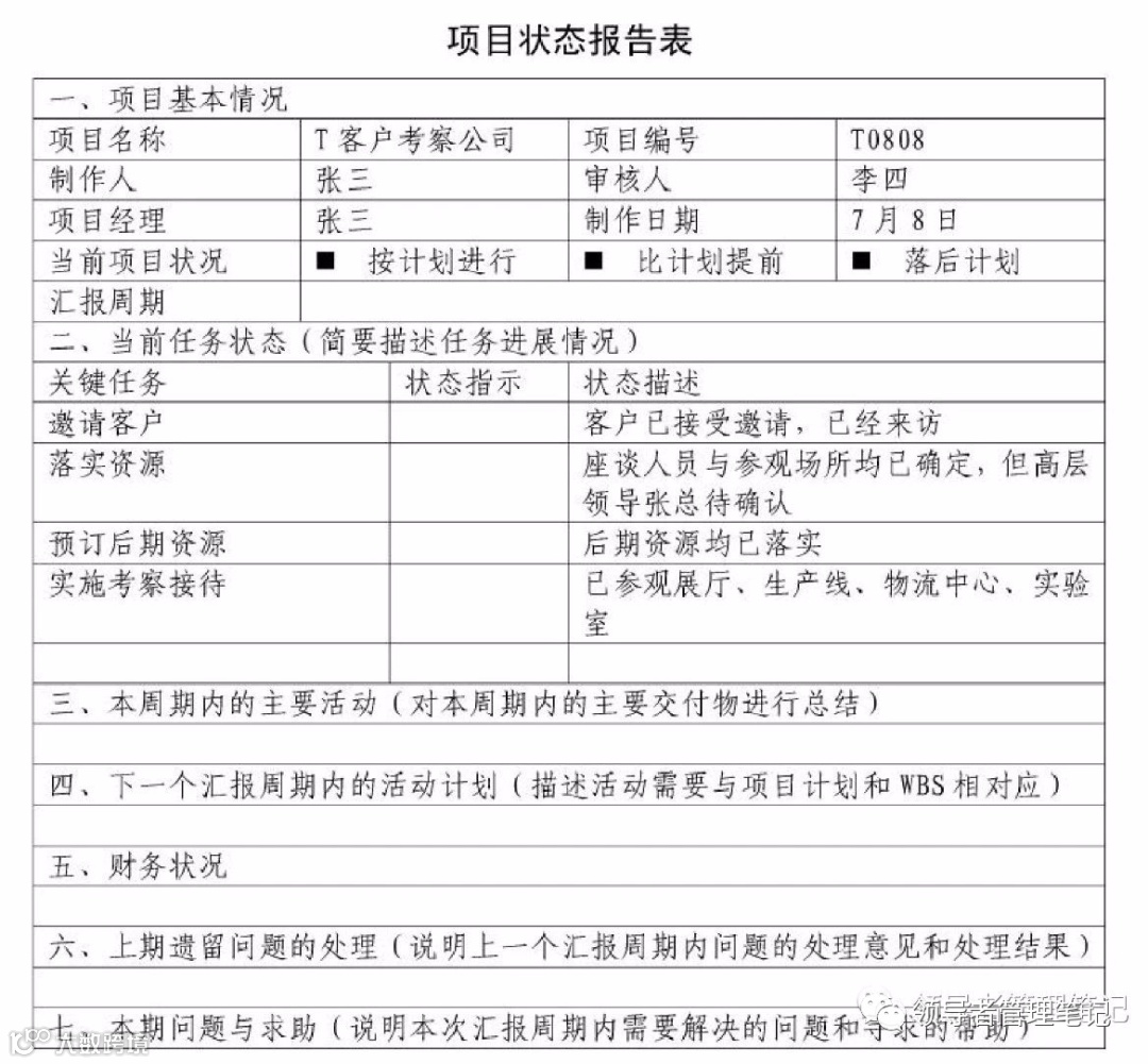 定期地、主动地向公司、甲方汇报项目的实施状态这就是《项目状态报告表》。