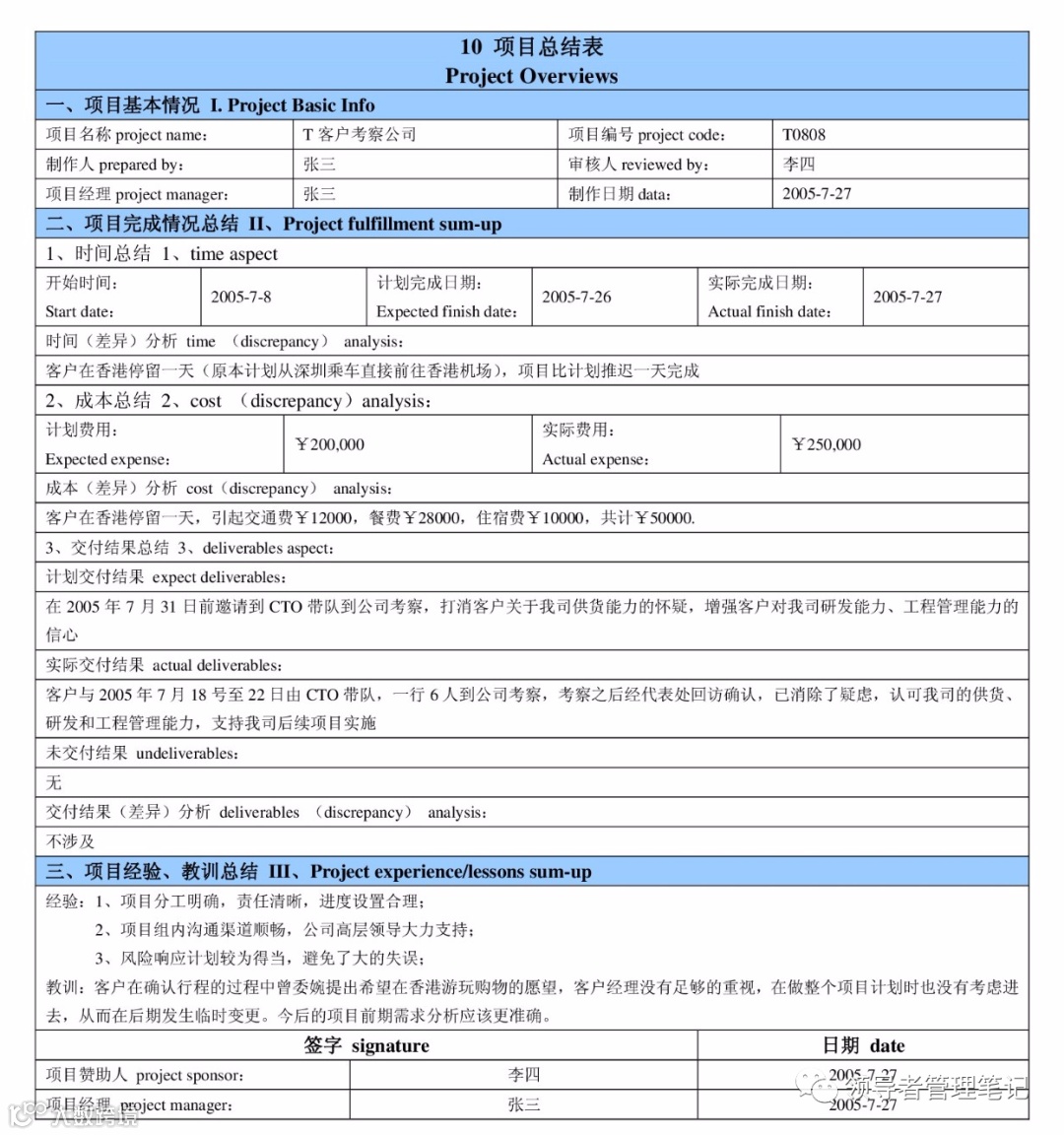 ③项目经验、教训总结:分条列项,把总结得到的经验和教训列出来,这是这张表的核心内容。