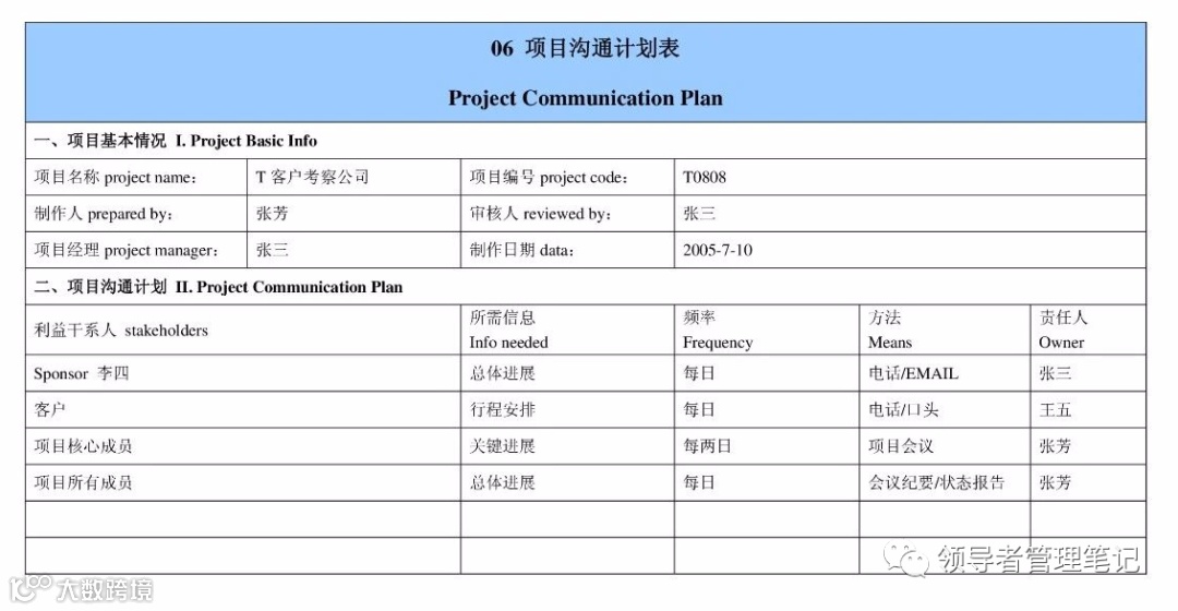 通过此表制定项目相关沟通方案。