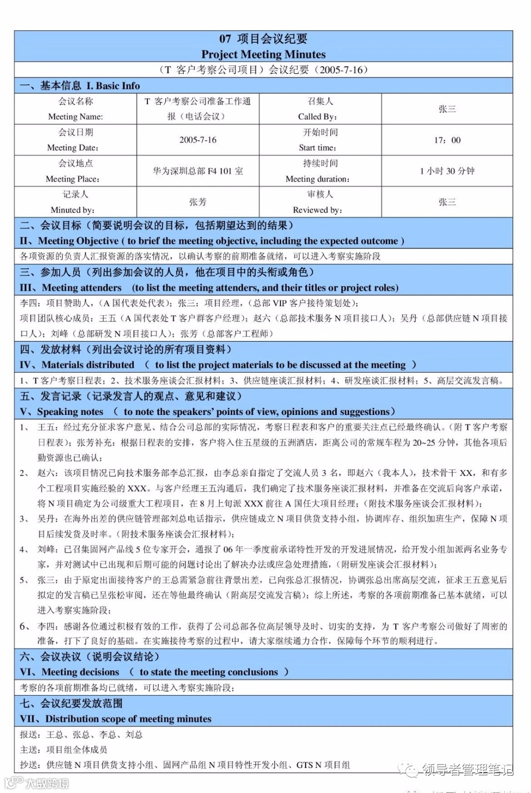 《项目会议纪要表》几大关键内容: