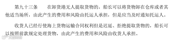 新法(2024版,第93条)明确:“卸货港无人提取货物的,船长可将货物卸至仓库等场所,费用和风险由托运人承担,但须及时通知托运人。”