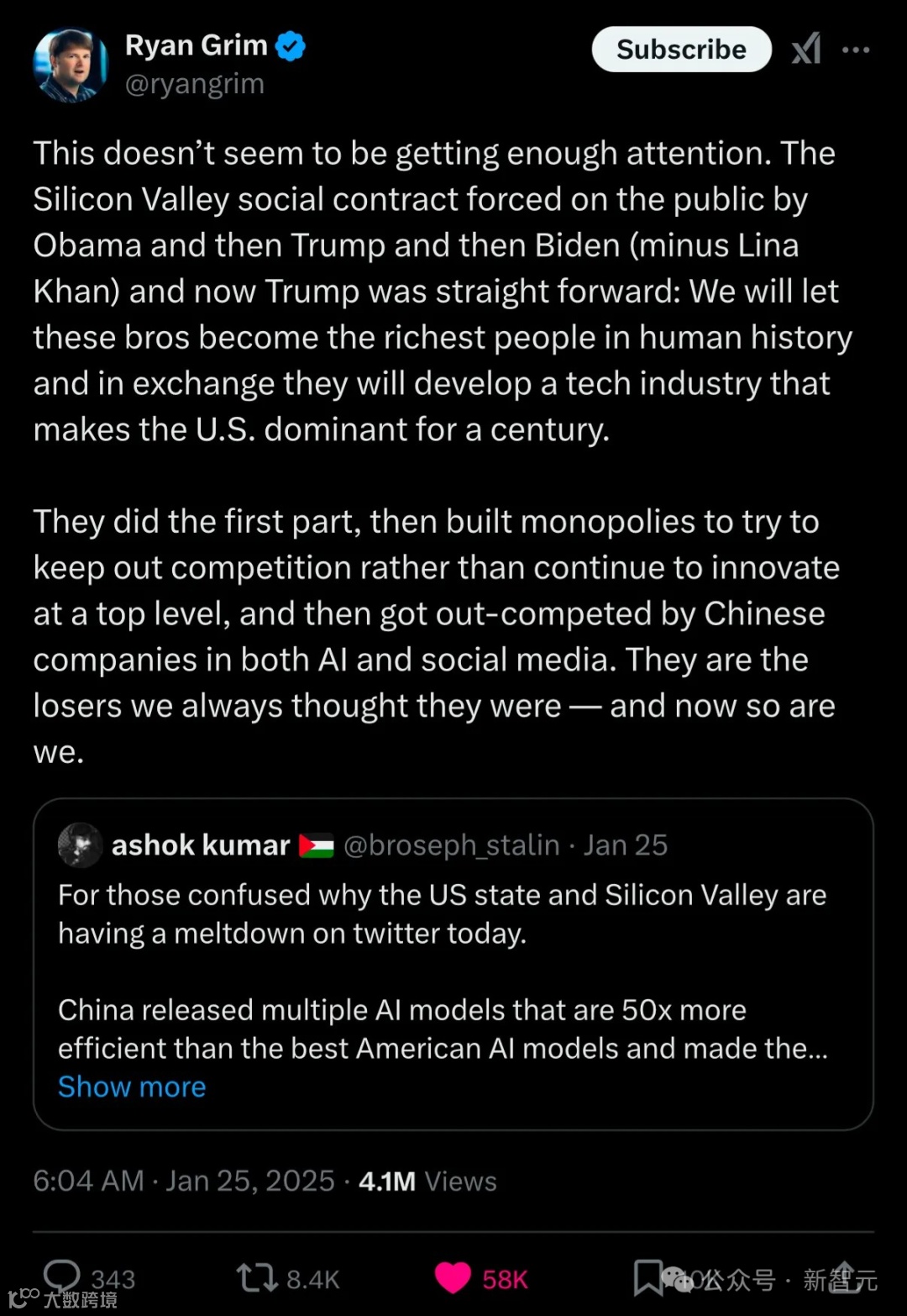 Ryan Grim在一条引起引广泛共鸣的推文中指出,美国政府一再因安抚大公司而犯错,而在培养独立创新上做得太少