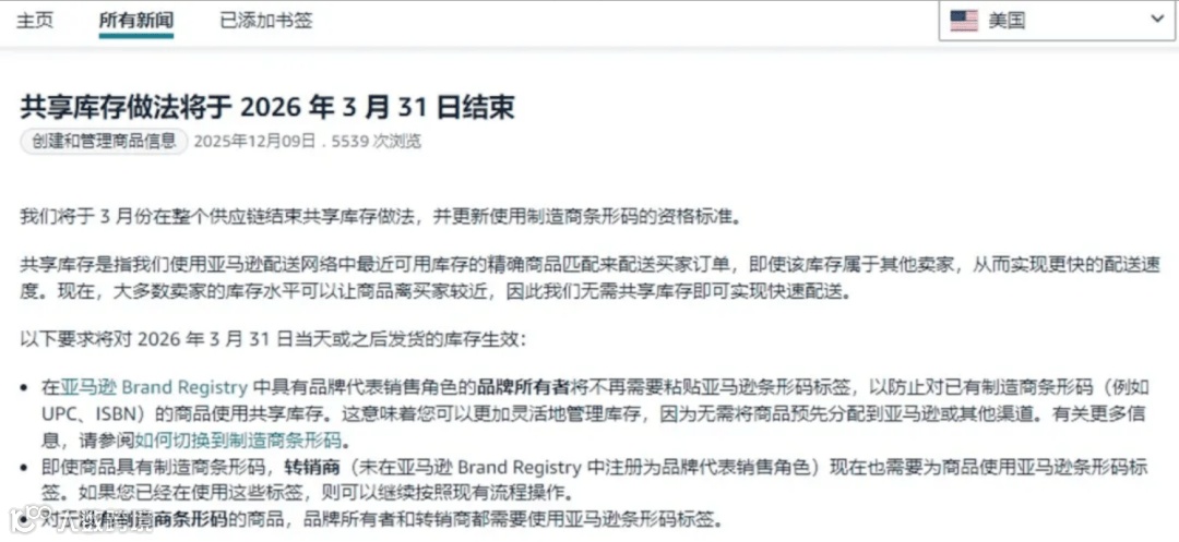 亚马逊宣布,自2026年3月31日起,美国、欧洲、加拿大、墨西哥、澳大利亚和日本站点将全面终止共享库存模式。