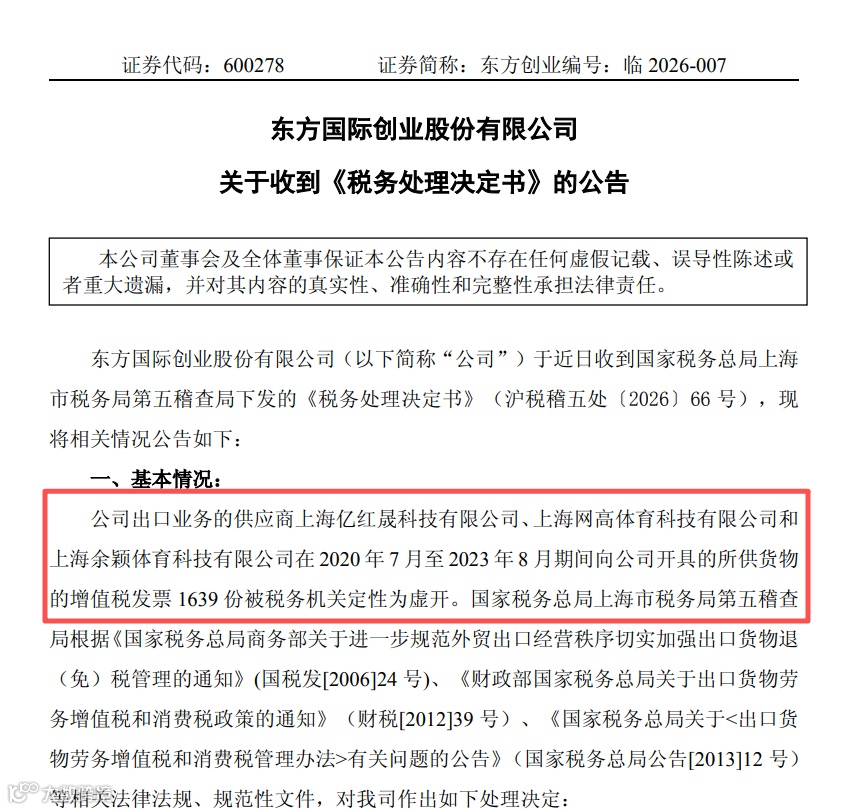 东方创业2020年7月至2023年8月期间,向三家体育用品供应商采购价值1.84亿元的网球线等产品,贸易流程真实合规:货物已出口至美国,单证齐全且货款收讫。然而,税务机关认定上述供应商开具的1639份增值税专用发票均为虚开。