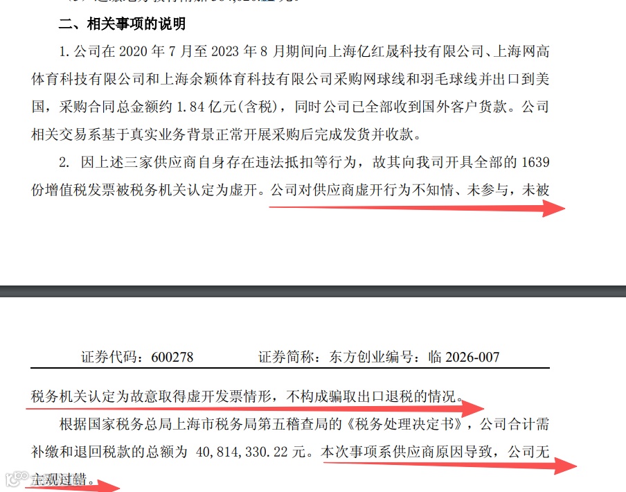 三项合计4081.43万元,叠加滞纳金后损失超4100万元。东方创业强调自身对虚开行为不知情且交易真实,但依法仍需承担补税责任,目前已启动供应商追偿程序。