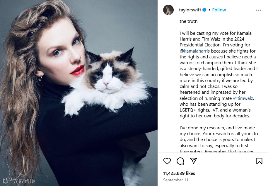 泰勒·斯威夫特在Ins宣布支持哈里斯