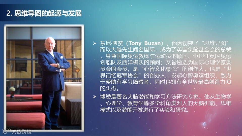 - 东尼·博赞的成就与贡献:作为大脑潜能和学习方法研究专家,从多学科角度研究大脑机能和思维模式。