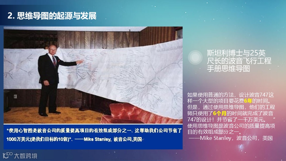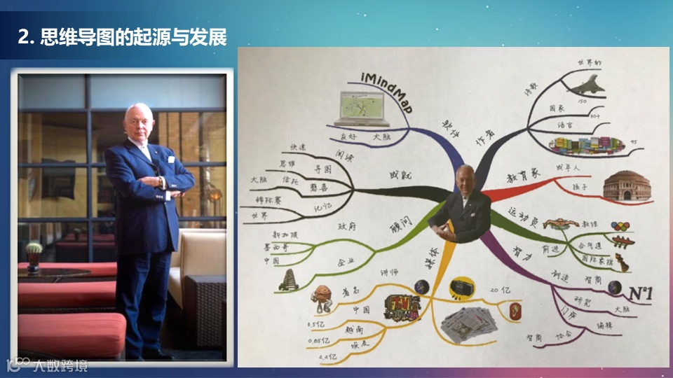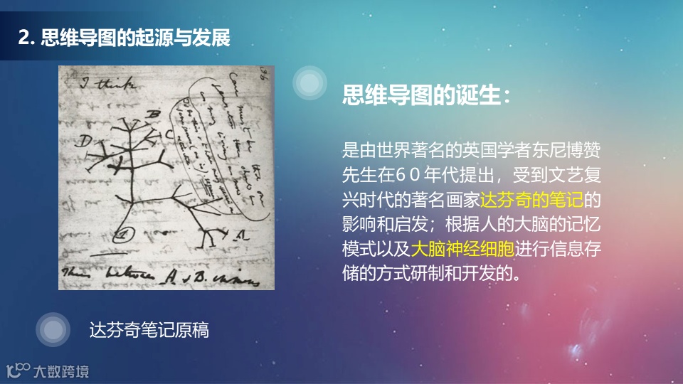 - 思维导图的诞生:由英国学者东尼·博赞在20世纪60年代提出,受达芬奇笔记启发。