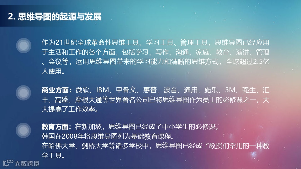 - 思维导图在全球范围内的广泛应用:包括学习、工作、管理等各个领域。