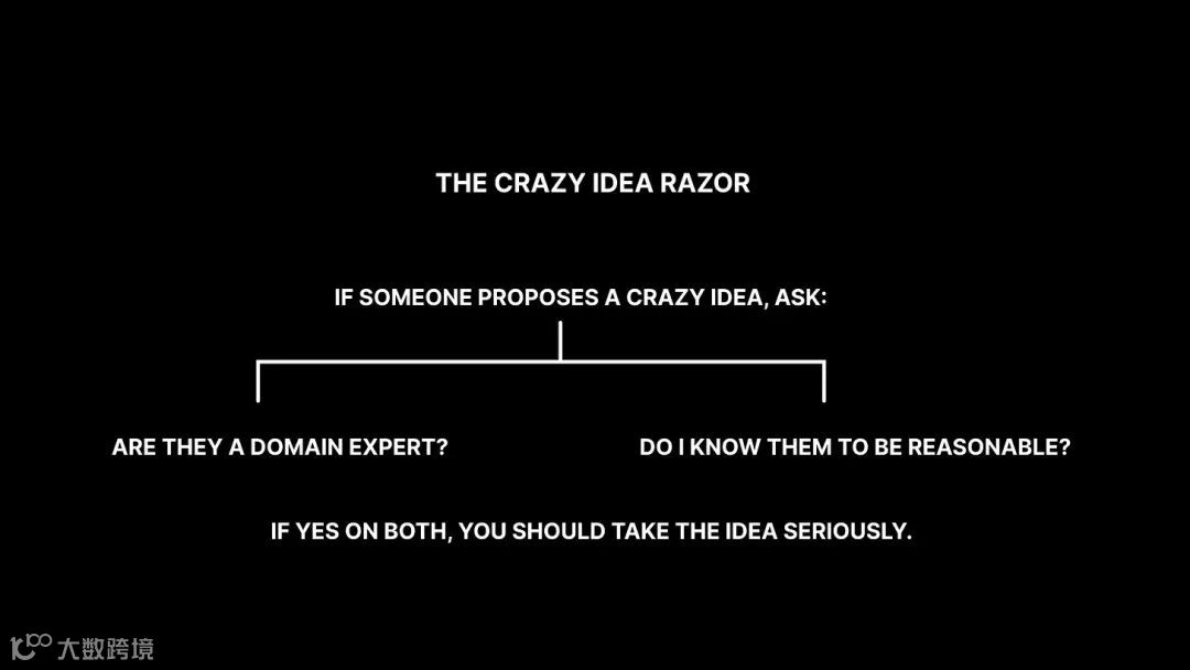 注:这一点至关重要,因为它反映了过去10-20年的许多重大技术创新。“保罗·格雷厄姆疯狂想法剃刀”很适合搭配“聪明的朋友剃刀”。