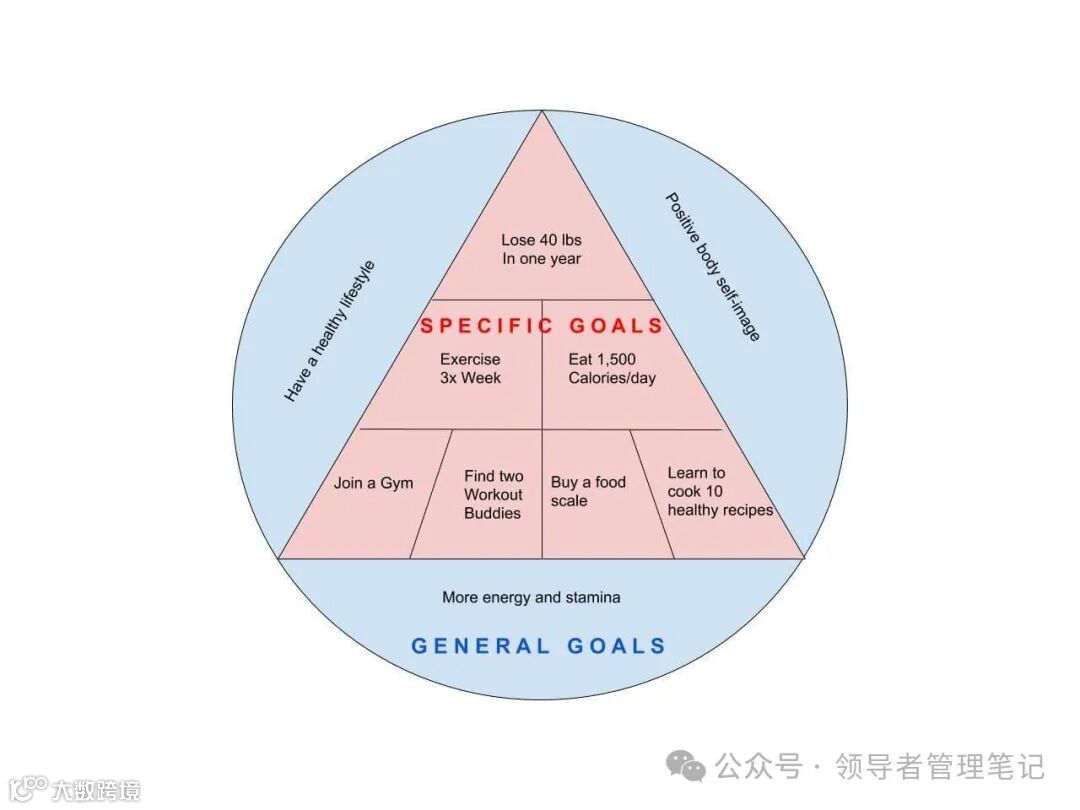 整个金字塔被代表价值观的圆圈包围,例如“追求健康生活”、“拥有积极的体态形象”等。这样,你的目标就有了价值观的指引,并且通过拆分成小步骤,可以让你长期保持动力。