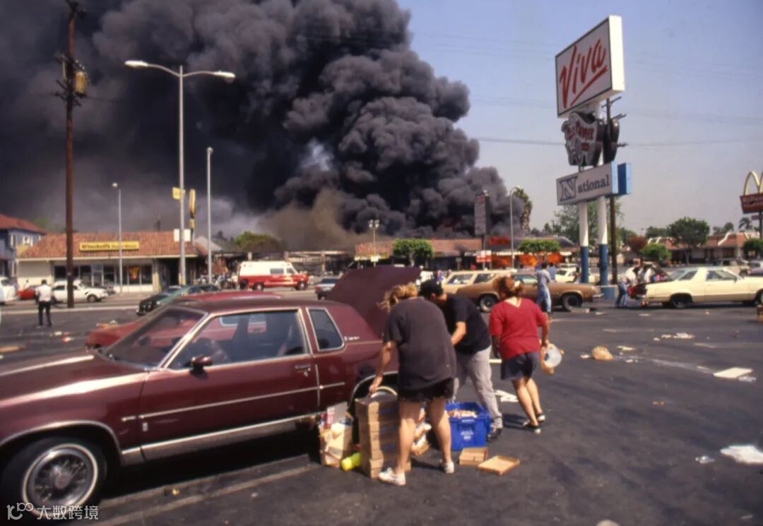 在1992年4月29日在洛杉矶爆发的骚乱中,抢劫者在滚滚大火附近的Viva购物中心装车,此前陪审团裁定四名洛杉矶警察局警官对罗德尼·金的殴打无罪。© Ron Eisenbeg/Michael Ochs Archives/Getty Images