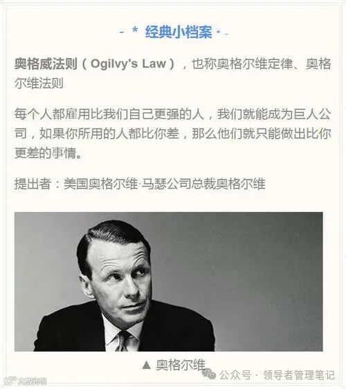 奥格尔维法则:每个人都雇用比我们自己更强的人,我们就能成为巨人公司;但如果你所雇用的人都比你差,那么他们就只能做比你更差的事情。