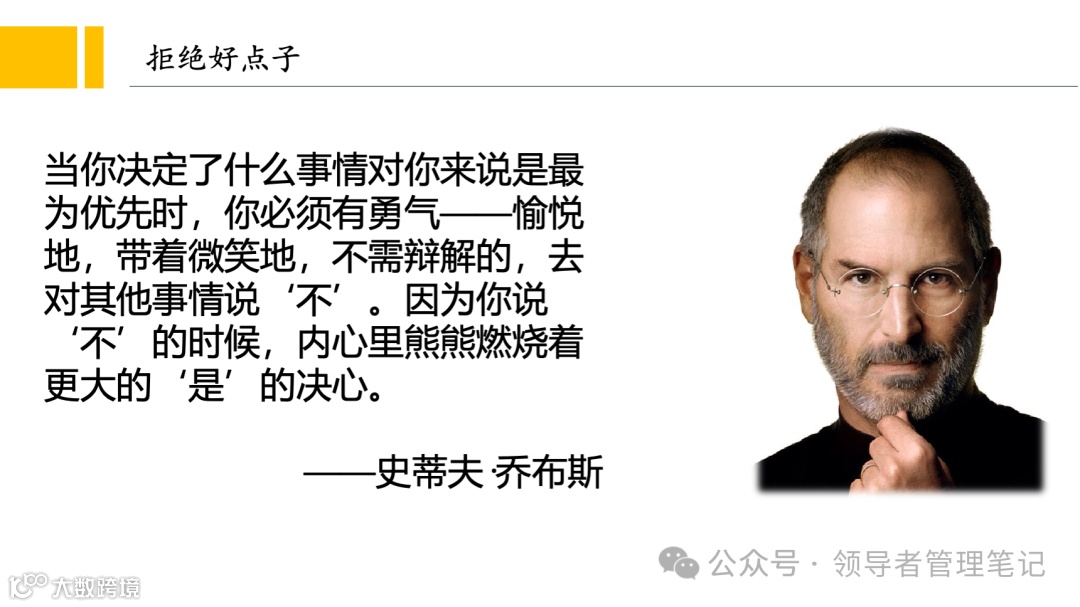 当你决定了什么事情对你来说是最为优先时,你必须有勇气——愉悦地,带着微笑地,不需辩解的,去对其他事情说‘不’。因为你说‘不’的时候,内心里熊熊燃烧着更大的‘是’的决心。