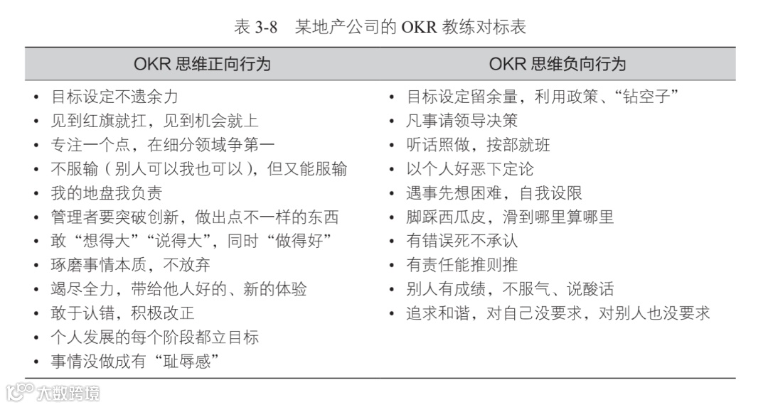 此外,这家公司还提炼了一张“OKR 教练对标表”,列出OKR思维正负向行为,把 OKR思维与公司倡导的文化价值观融合如图所示。