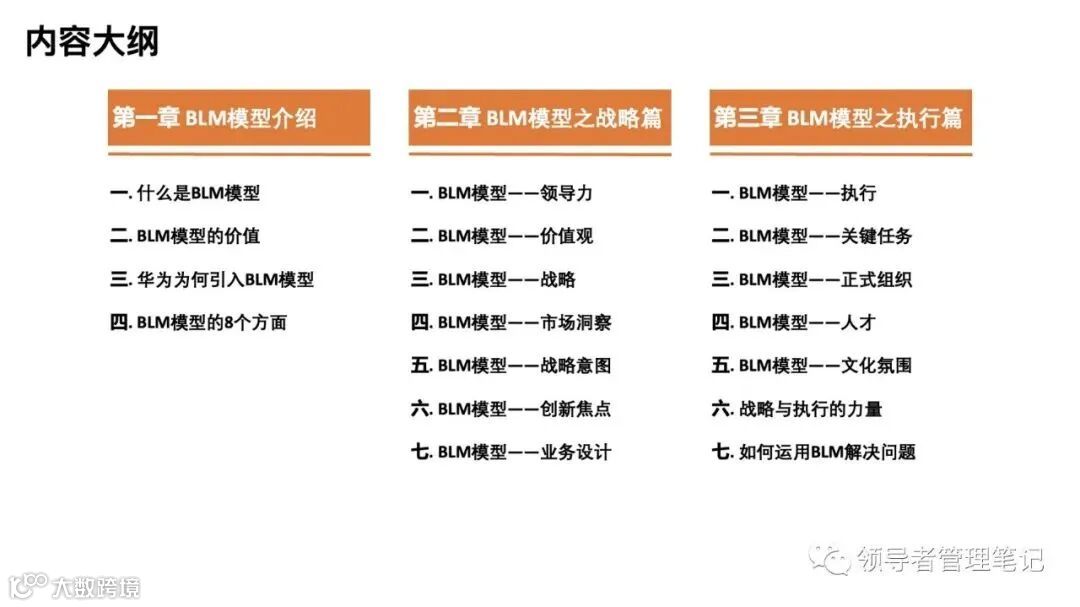 ►领导者说:★BLM模型(Business Leadership Model),中文通常被翻译为“业务领导力模型”或者“业务领先模型”,是IBM在2003年推出的一套连接企业战略制定与执行的战略管理方法,因为华为的引入和使用而被众多的中国企业所熟知。这套方法使用的概念体系,与企业管理实践中常用的概念体系有明显差异,因此增加了理解上的困难。我们对这套方法的底层逻辑进行剖析之后发现,这套方法与我们此前总结推出的“华沣战略解码系统(HSDS)”基本一致,就其系统性而言,算得上战略管理方法中的佼佼者,值得解读和学习。