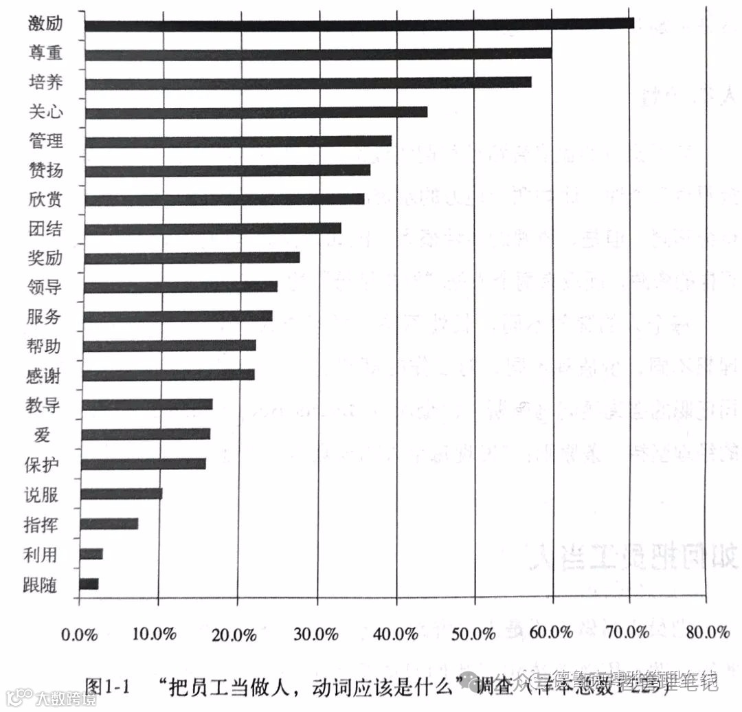 最准确的答案,应该来自于员工自己。2008年,我针对中国企业员工做了3次抽样调查,问的是同一个问题:企业对员工的动词应该是什么?3次得到的结果几乎一模一样,排在前四位的动词都是激励、尊重、培养、关心,排在后四位的动词都是说服、指挥、利用、跟随(见图1-1,这是2008年5月的调查成果,其他两次调查结果与之相似)。