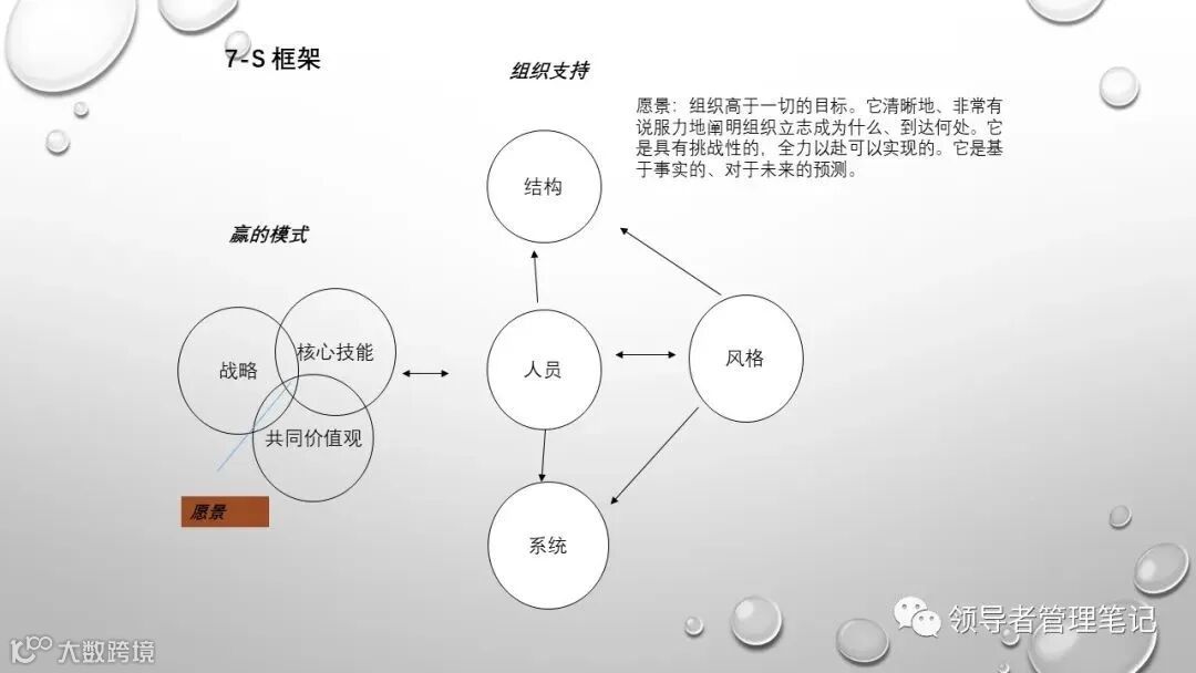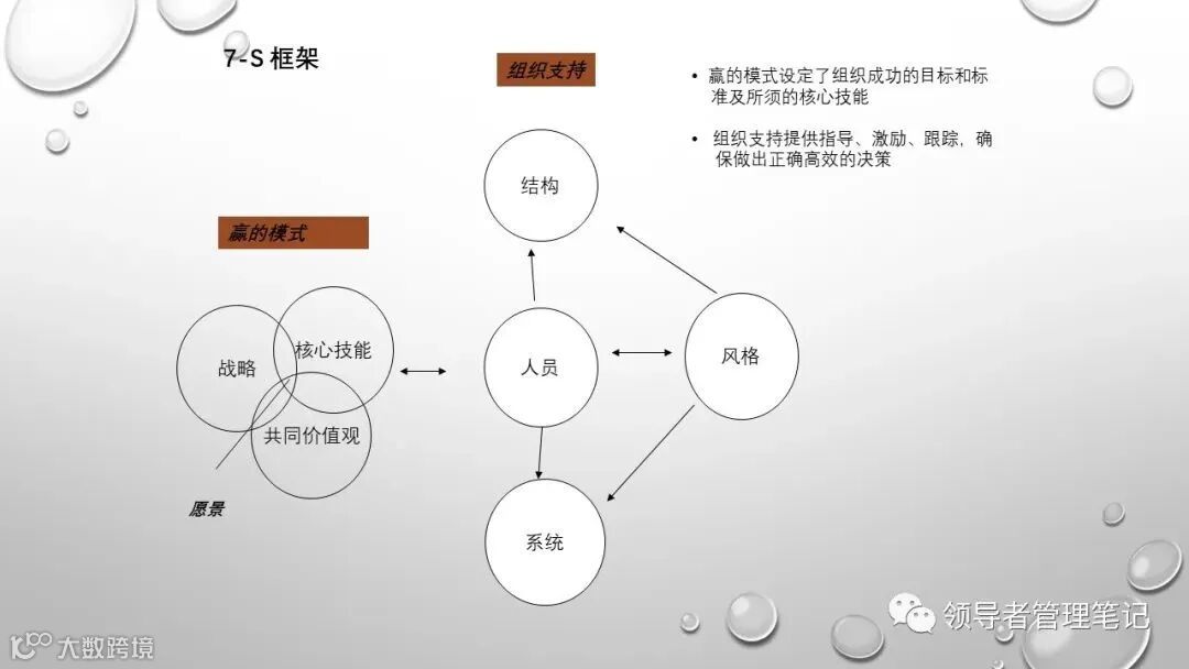 7S模型的核心价值在于揭示组织效能源于硬件要素(战略、结构、系统)与软件要素(价值观、人员、技能、风格)的动态匹配。例如: