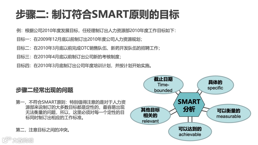 定性目标量化:“提升员工满意度”→“季度调研满意度≥85分,较上季度提升5%”;