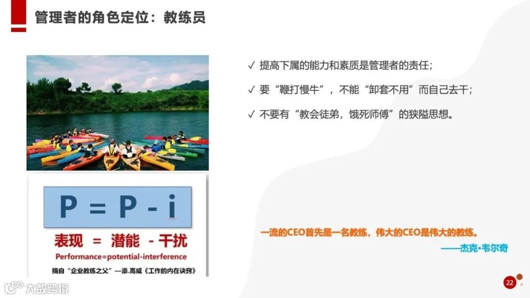 教练员: 培养下属的能力,敢于放权,而不是自己大包大揽。杰克·韦尔奇说得好:“一流的CEO首先是一名教练。”