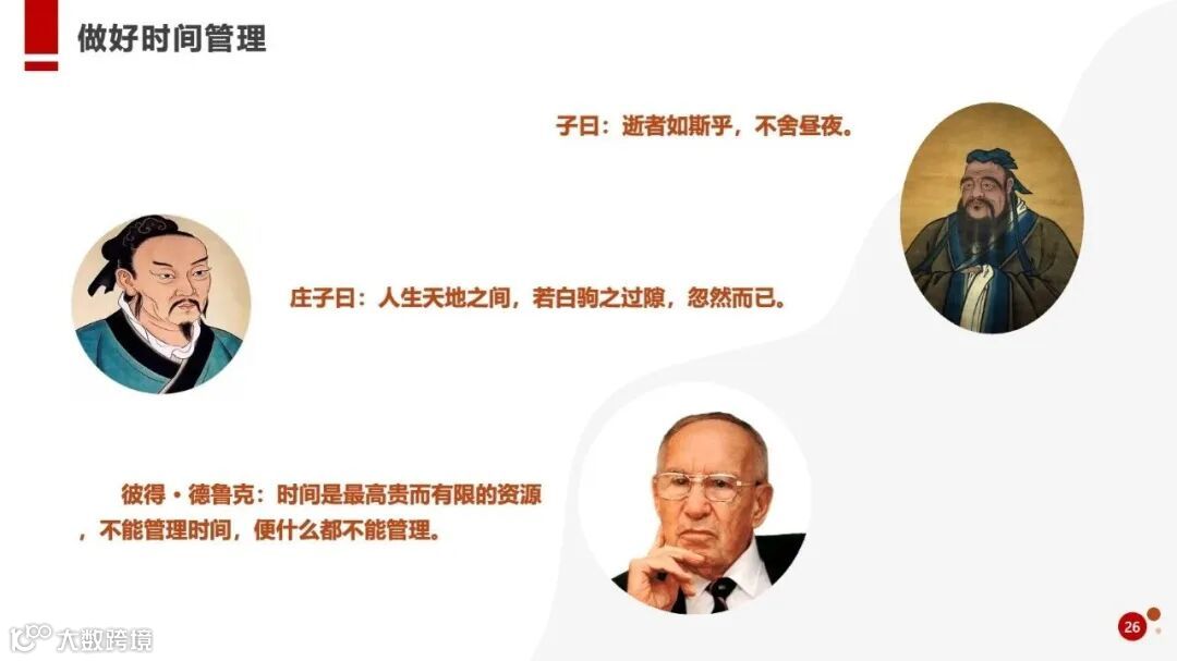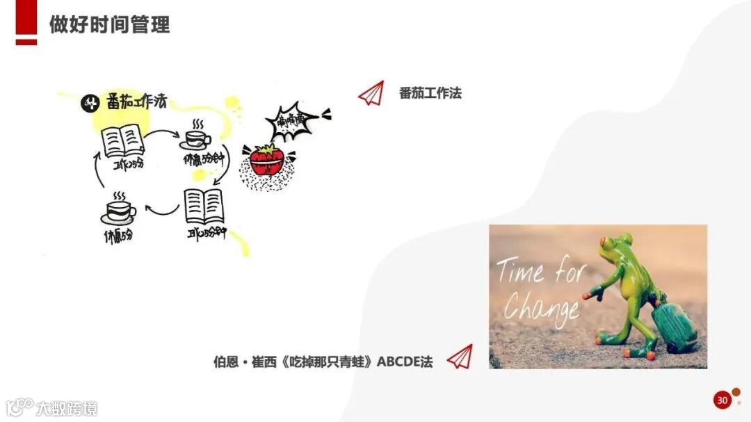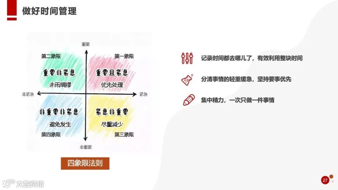 时间是最稀缺的资源。学会记录时间去向,分清轻重缓急,一次只做一件事。无论是“四象限法则”、柳比歇夫的时间统计法、GTD,还是番茄工作法,都是帮助你掌控时间的利器。