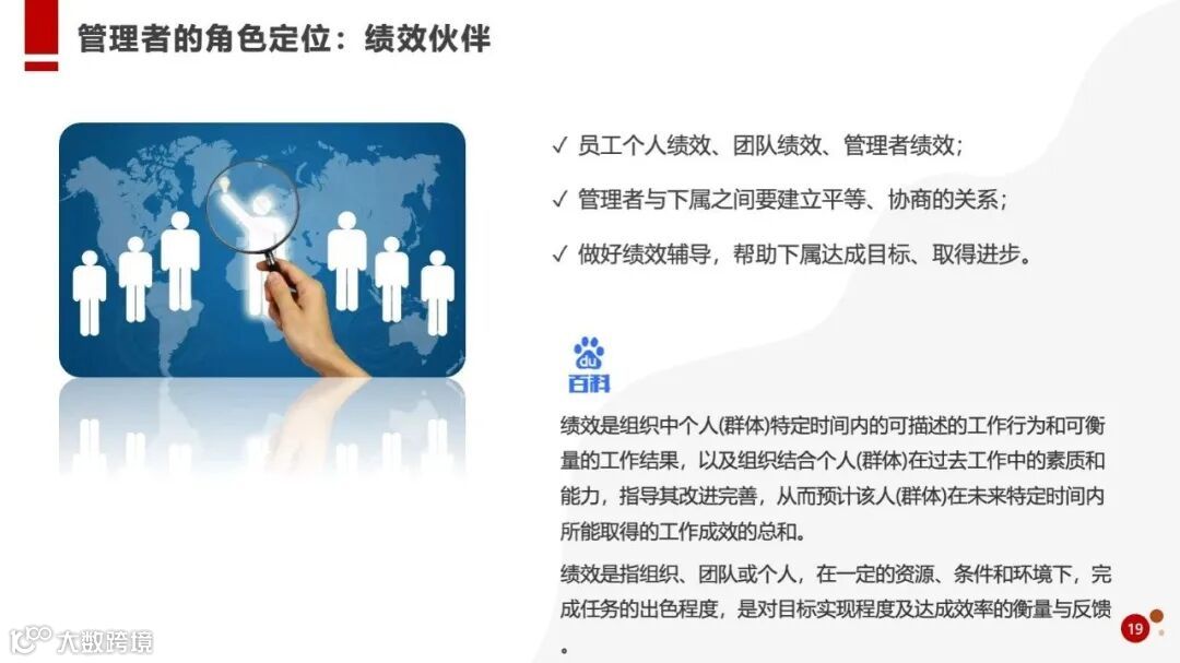 绩效伙伴: 与下属共同设定目标,提供辅导,帮助他们成长和达成业绩。绩效不仅仅是结果,更是一个持续改进的过程。