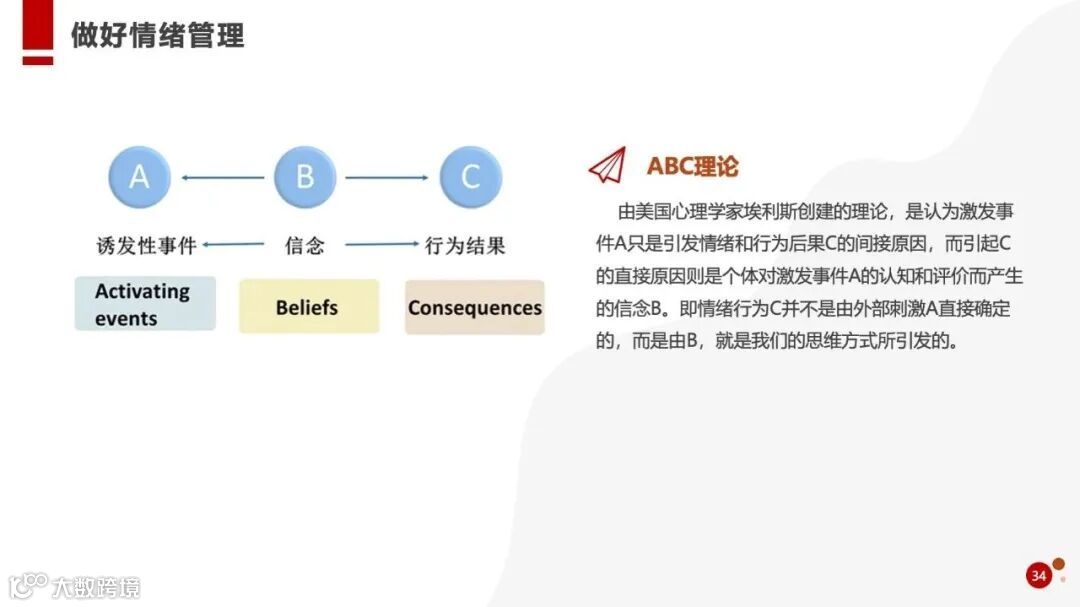 理解ABC理论:不是事件本身(A)引发了情绪(C),而是你对事件的信念(B)导致了情绪。改变B,就能改变C。在高压环境下,管理好情绪本身就是一种重要的专业能力。