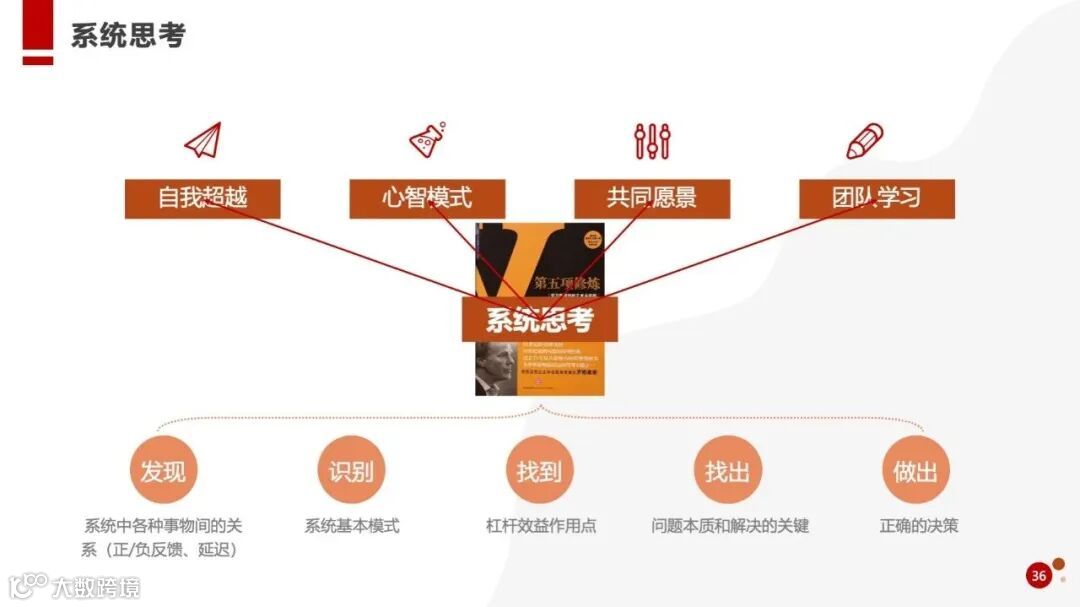 看到事物之间的关联,找到问题的本质和关键,而不是头痛医头脚痛医脚。这需要“自我超越”、“心智模式”、“共同愿景”和“团队学习”。