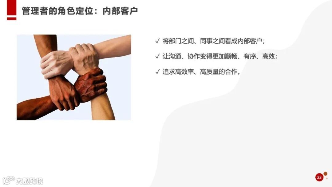 在同僚面前代表内部客户: 把其他部门当作自己的内部客户,以协作共赢的心态推动工作。
