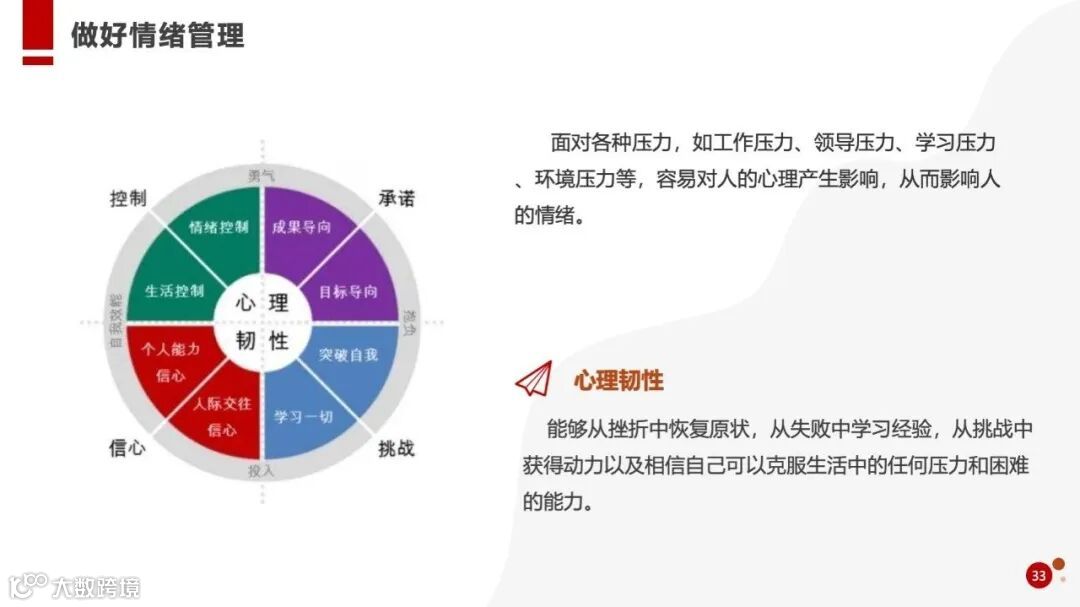 情绪是人之常情,但被情绪控制则会影响判断和决策。提升“心理韧性”,承认挫折,从失败中学习,相信自己能克服困难。