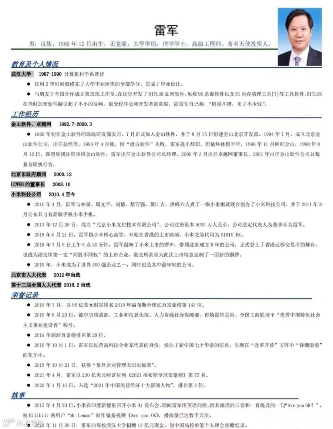接下来看看雷军的简历,早期在金山软件研发部学习,怎么说也跟咱们一样程序员啊,不过同样是写代码的,但他 28 岁已经是 CEO,我 28 岁还在写增删改查。