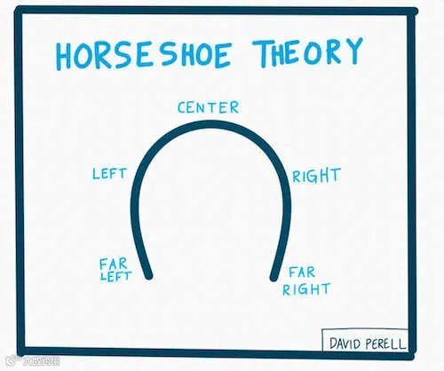 34、马蹄铁理论。极端对立面往往看起来相同。例如,极右运动和极左运动可能同样暴力,或者渴望得到类似的结果。两边的人比中间派的人更相似