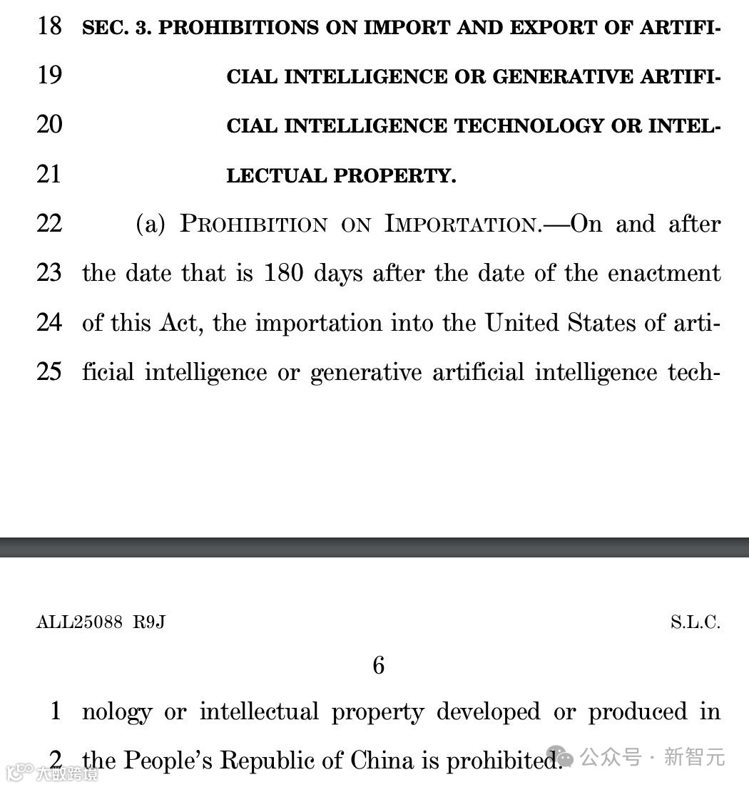 新法案名为《2025年美国人工智能能力与中国脱钩法案》(Decoupling America’s Artificial Intelligence Capabilities from China Act of 2025),核心是禁止美国人在中国境内推进AI能力,中美在AI领域彻底脱钩。