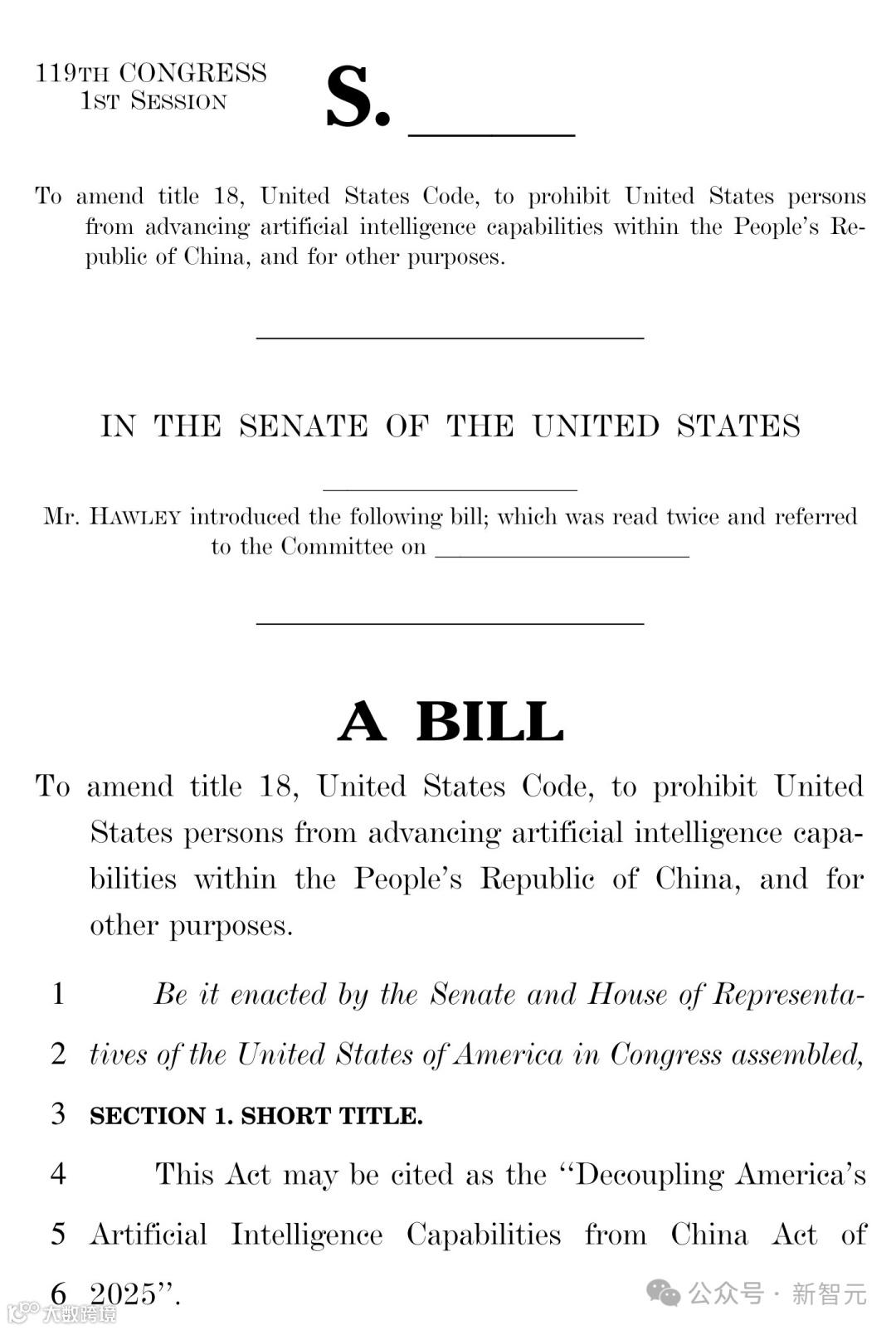 法案链接:https://www.hawley.senate.gov/wp-content/uploads/2025/01/Hawley-Decoupling-Americas-Artificial-Intelligence-Capabilities-from-China-Act.pdf