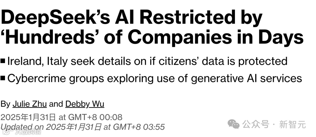 1月31日,彭博报道,已有「数百家」公司(尤其是与政府相关的企业)屏蔽了DeepSeek。