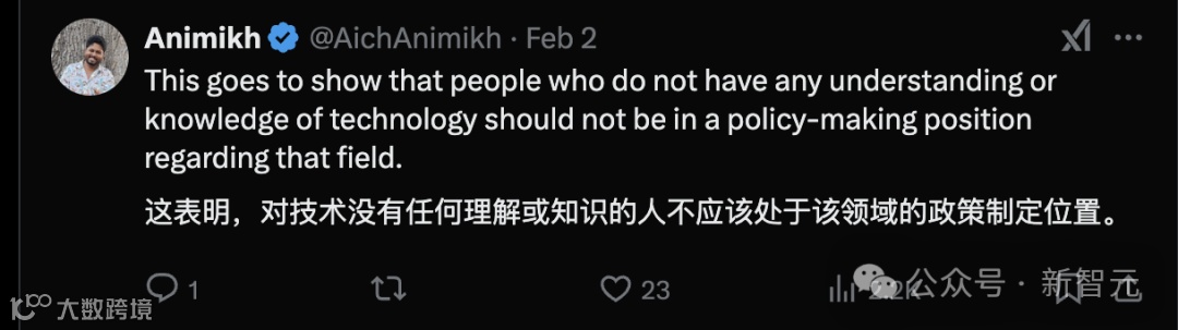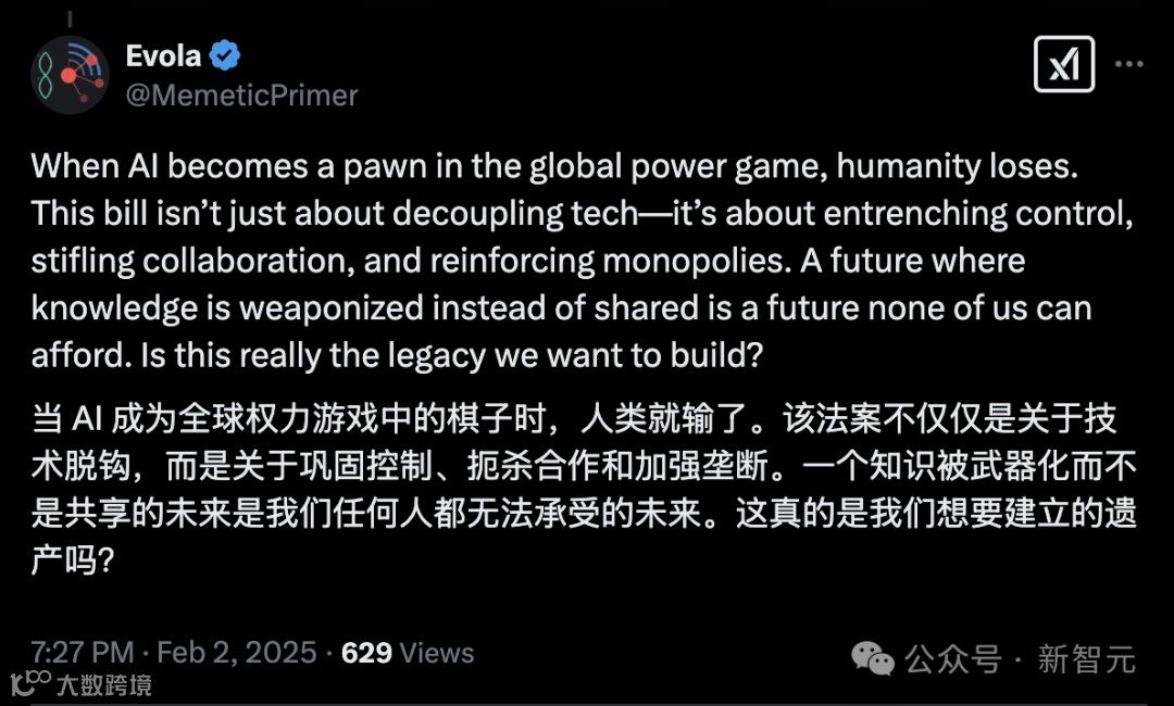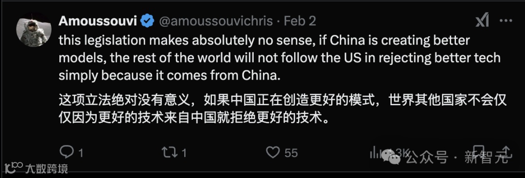 在Deepseek事件之后,我认为任何人都能理解,该法案对AI未来的发展将是多么有害。想象一下,如果这项法案在Deepseek之前就已经生效,AI平民化的讨论可能根本不会发生,现在所看到的更具希望的AI未来也不会存在;仍然会面临由少数几家公司控制的封闭模型的AI未来。而这很可能正是这项法案的目的所在。