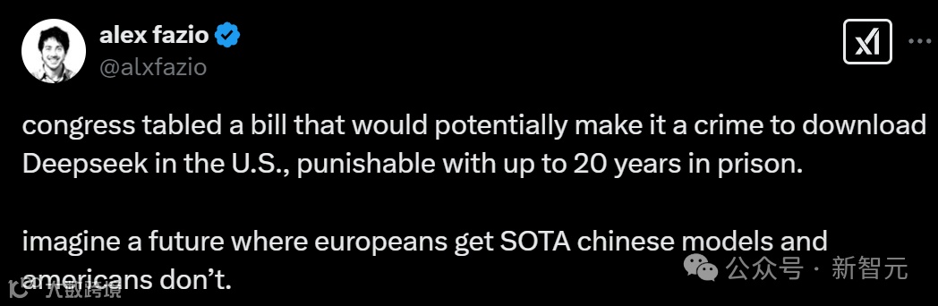 【新智元导读】在美国下载DeepSeek,将判处最高20年监禁?现在,美国国会已经立法,全面禁止来自中国的先进AI模型。美国国防部、国会、海军、NASA以及德州已相继禁止在政府官方设备上使用DeepSeek。