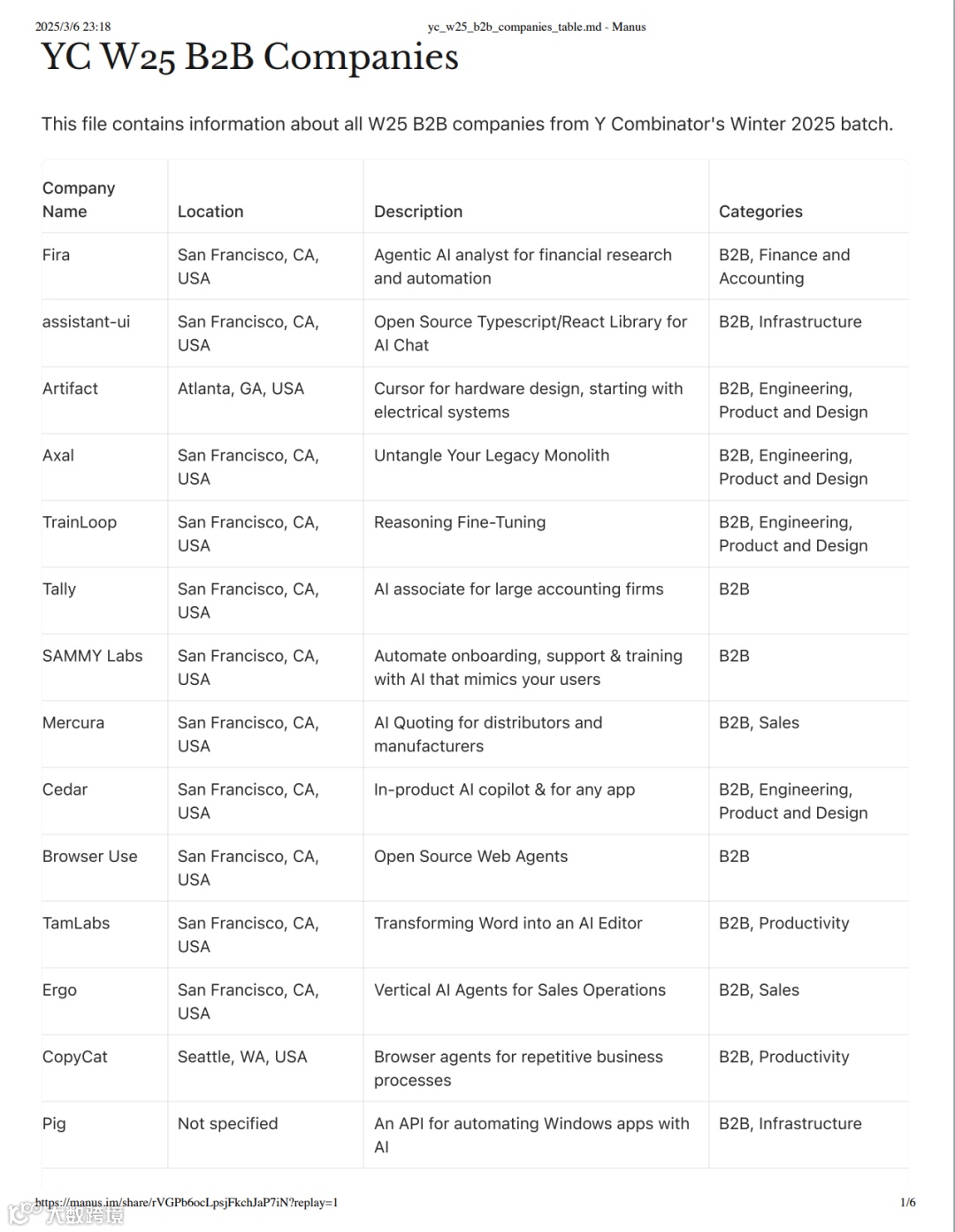 告诉Manus要分析的具体公司。Manus直接输出N页的公司分析报告。